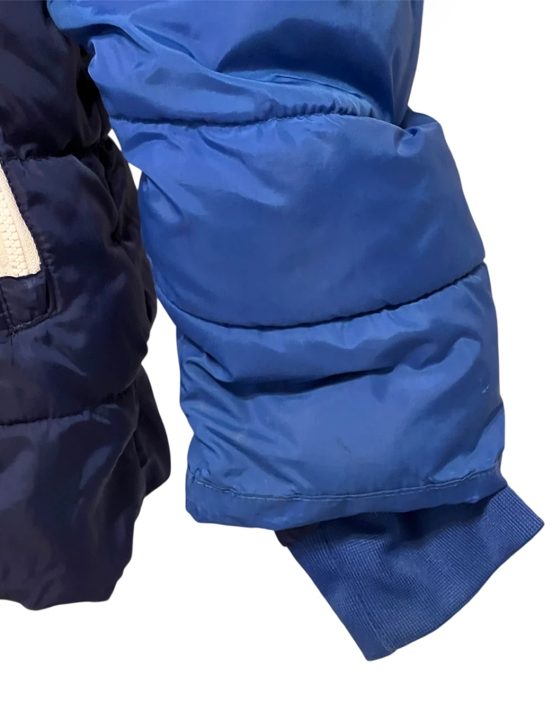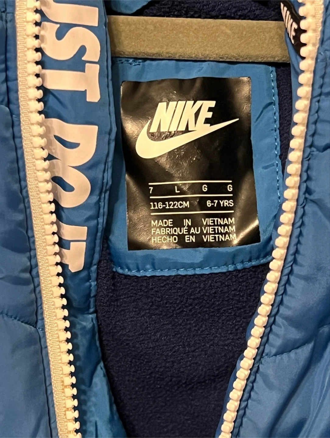 Stylish and warm Nike puffer jacket in shades of navy and blue with a full front zipper and cozy hood. Features the classic Nike swoosh logo on the chest and “Just Do It” inner trim. Lightweight yet insulated — perfect for fall and winter wear.