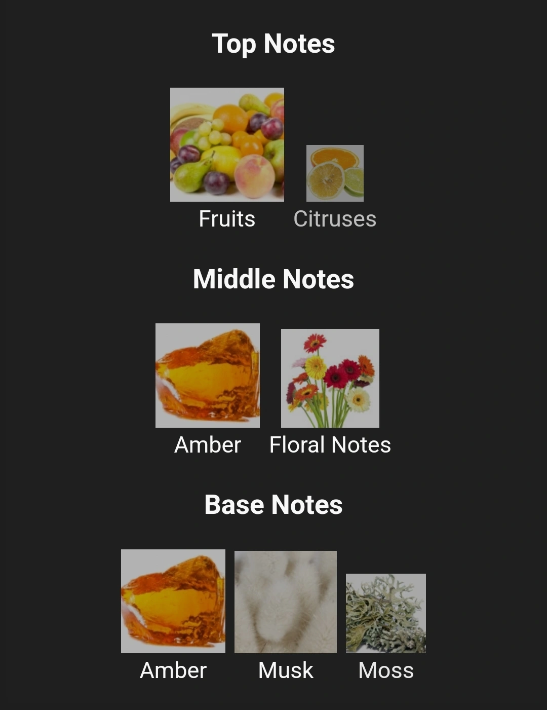 Top notes include fruits and citruses, middle notes feature amber and floral notes, and base notes consist of amber, musk, and moss