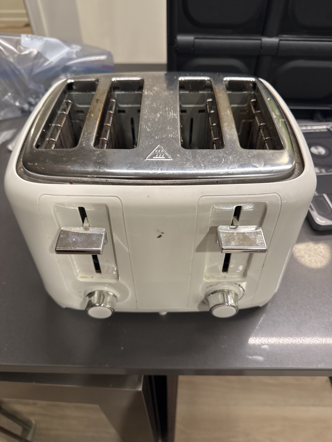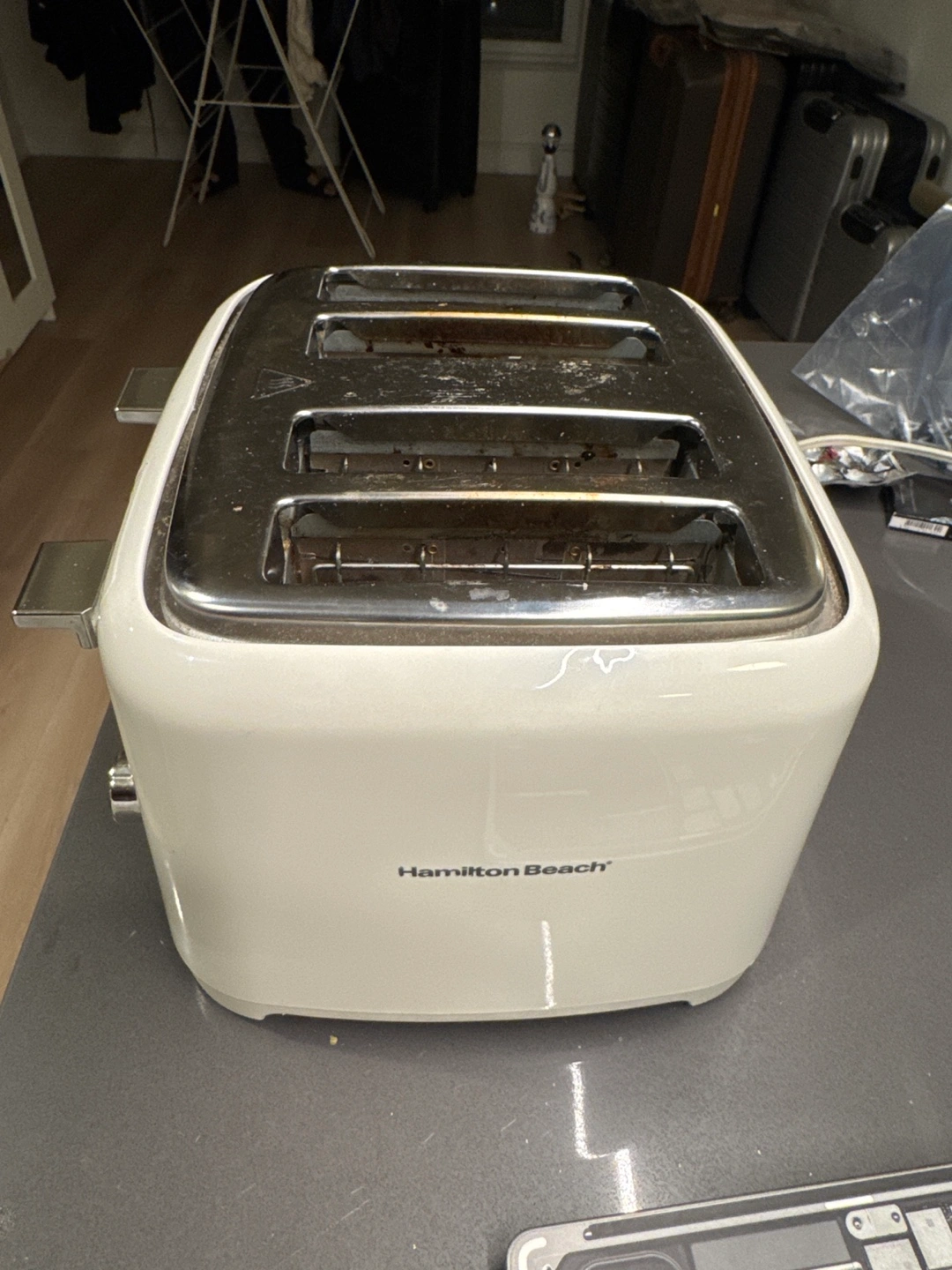 Selling a Hamilton Beach 4-slice toaster in white. It's in good working condition and ready to toast your favourite breads and pastries. Perfect for a family or anyone who loves a good breakfast!