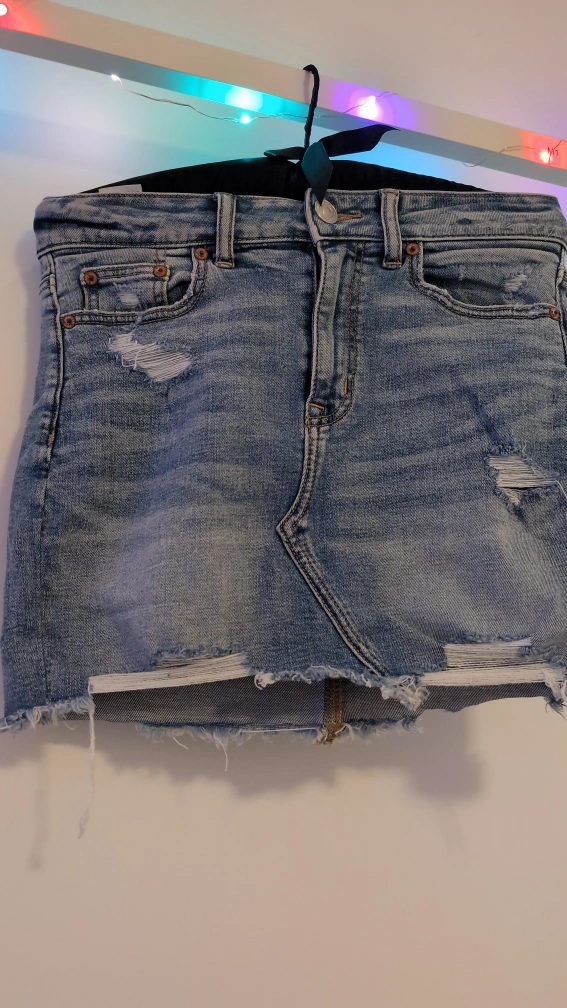 Selling an American Eagle denim mini skirt in size 2. It's in good condition and ready for a new home! The skirt is made of 98% cotton and 2% elastane, making it comfortable and slightly stretchy. It has a distressed, frayed hem for a trendy look