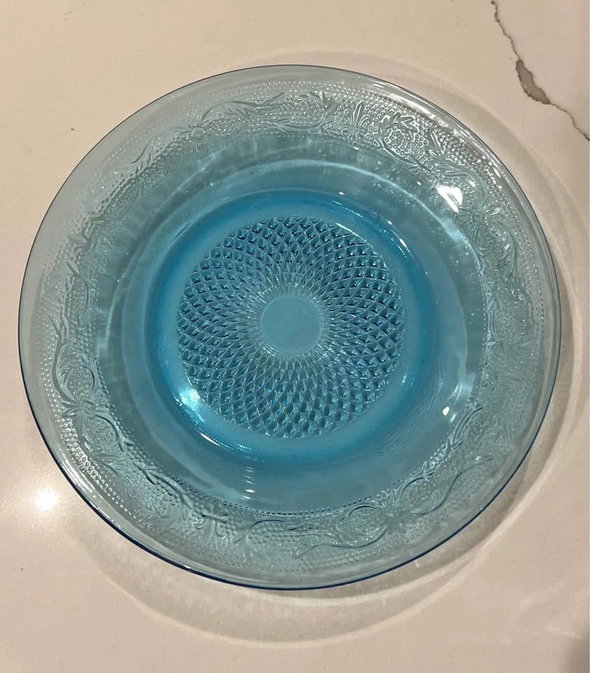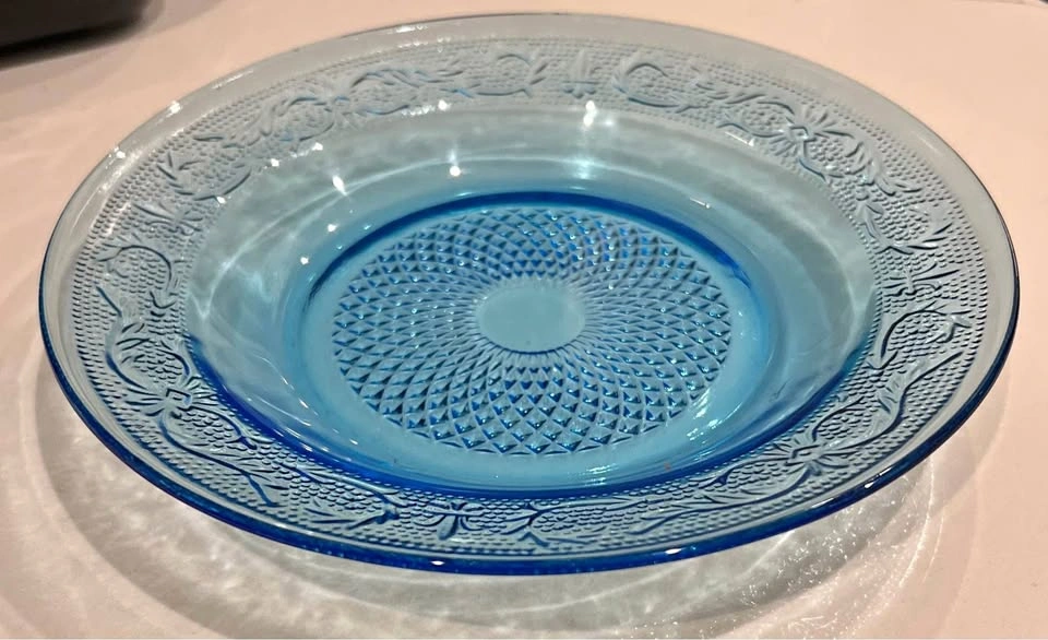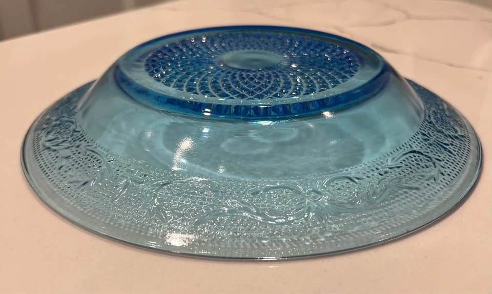 This is a vintage Firna glass bowl, featuring a "Fleur de Lis" pattern. This item was made in Indonesia and is described as having a "Sandwich glass" style. The pattern includes a raised diamond or beaded design on the bottom with a floral or scroll border. Made of blue glass.