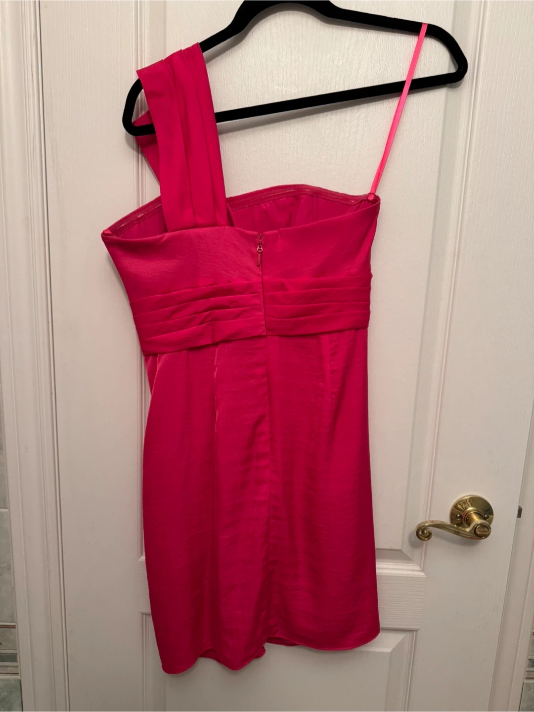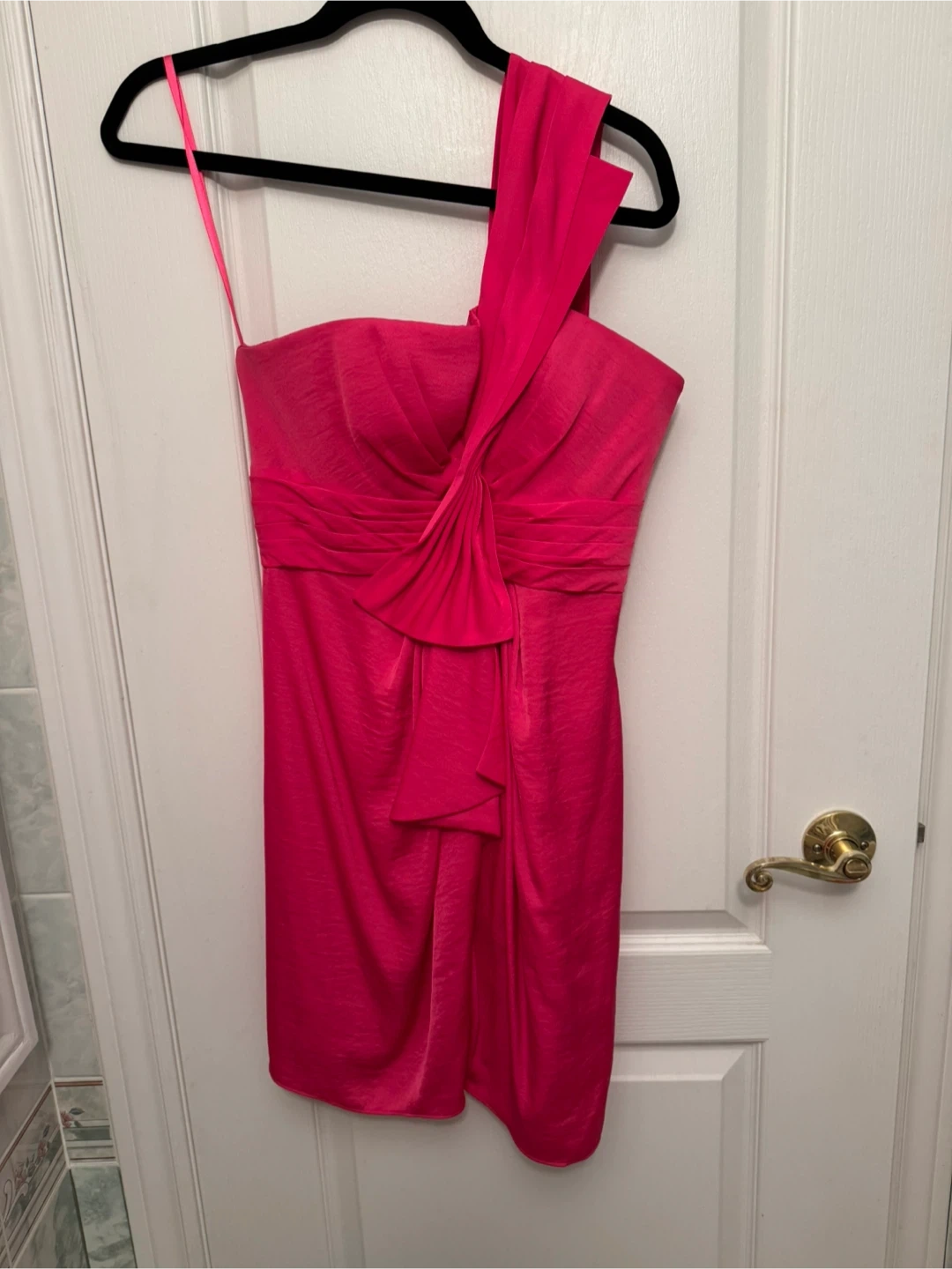 Hot pink dress in great condition! It's a one-shoulder style and would be perfect for a night out or a special occasion. The shoulder strap was lightly stitched (to make it shorter) but it can easily be undone.