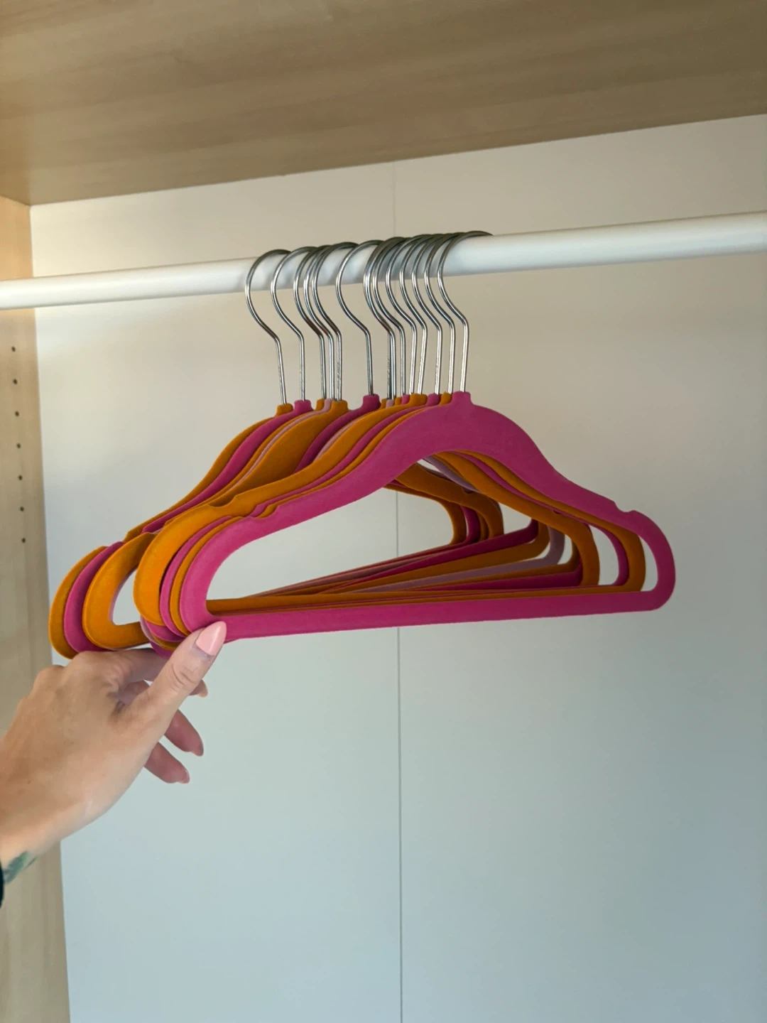 Selling a set of velvet clothes hangers in a mix of pink and orange colours! These hangers are great for keeping your clothes from slipping and saving space in your closet. They're in excellent condition and ready for a new home!