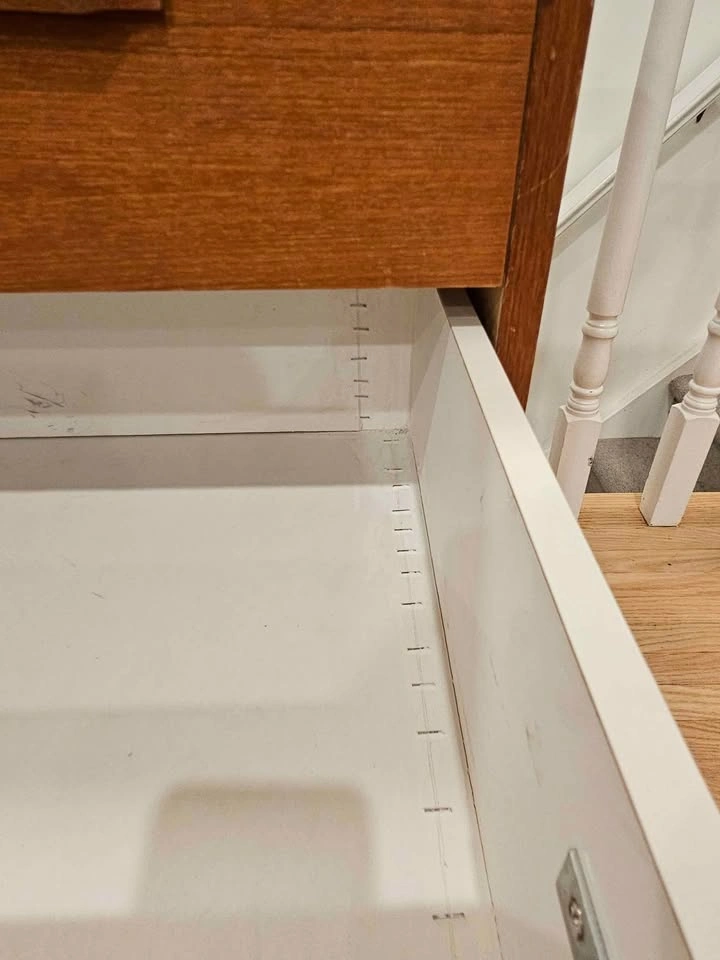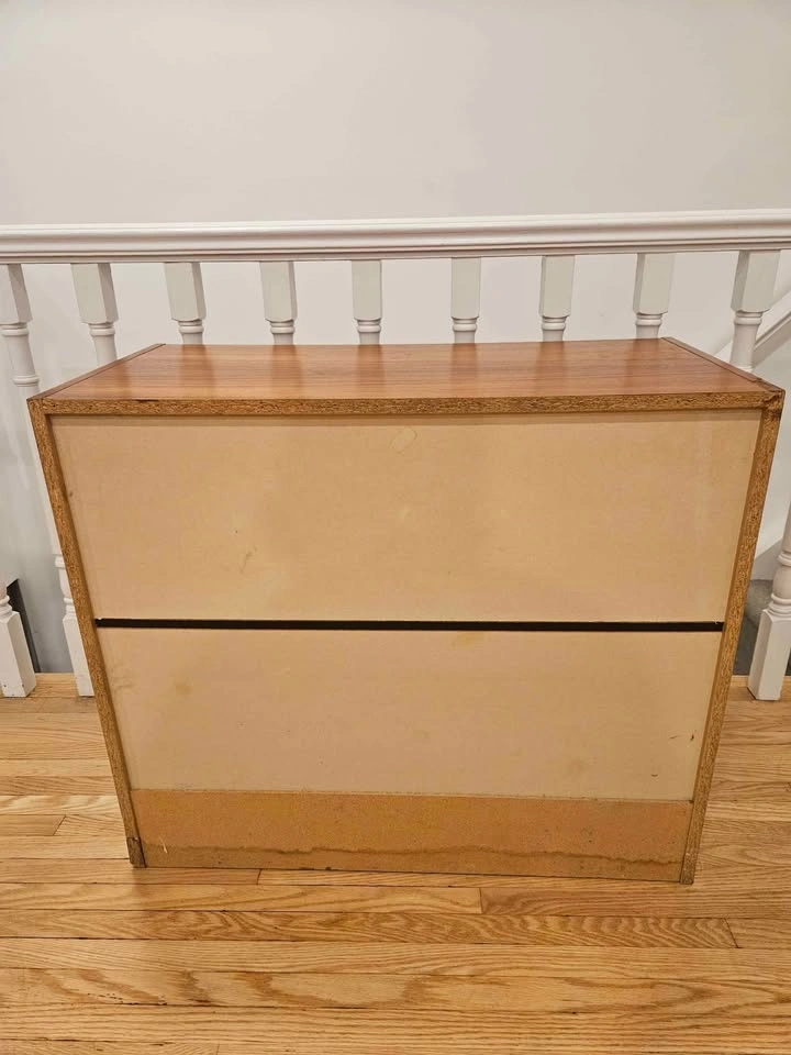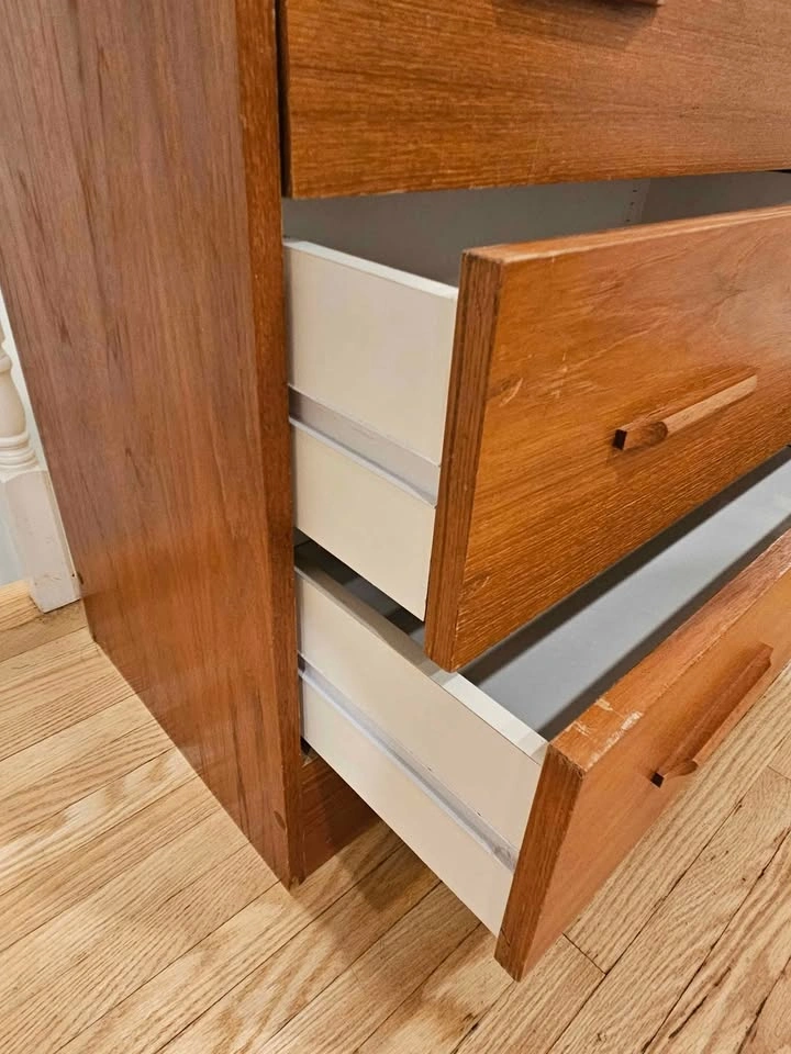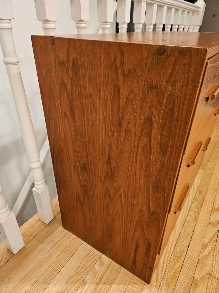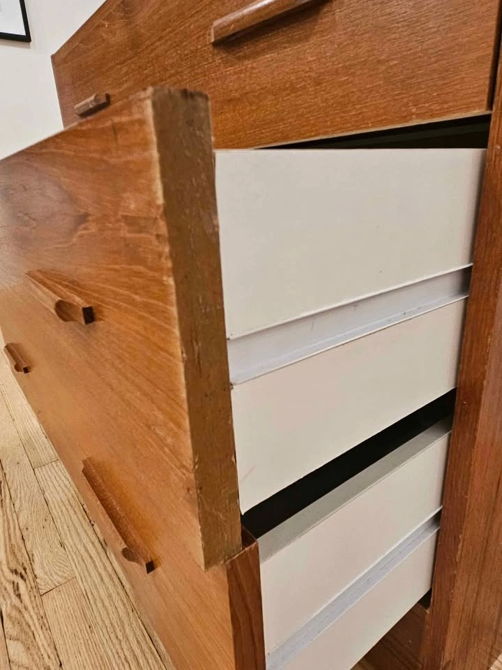 Teak veneer on particle board. Shows some sign of wear - missing edge banding on side of one drawer and the top back edge (see second last photo). One drawer was reinforced (see last photo).