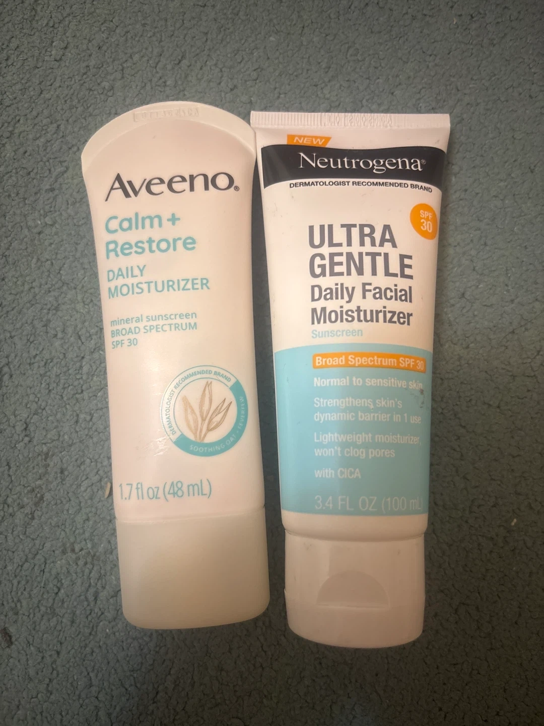 192Selling two new sunscreen/moisturizers: Aveeno Calm + Restore Daily Moisturizer with mineral sunscreen SPF 30 (1.7 fl oz / 48 mL) and Neutrogena Ultra Gentle Daily Facial Moisturizer with sunscreen Broad Spectrum SPF 30 (3.4 FL OZ (100 mL)) Both are lightweight and won't clog pores. Expiry date is 2026/06.