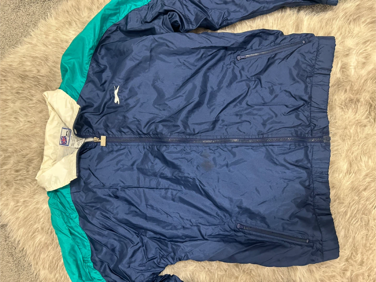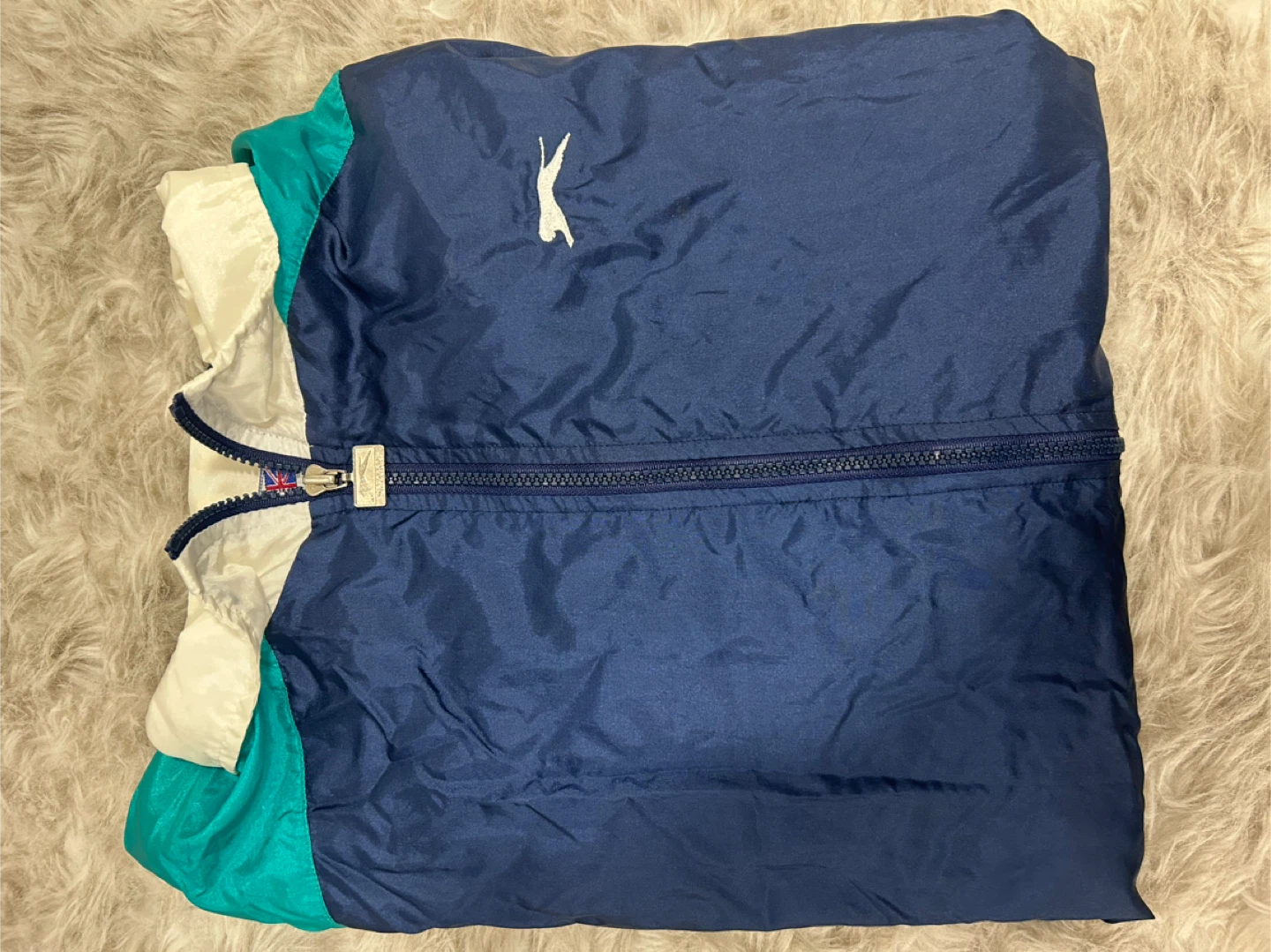 Selling a vintage Slazenger windbreaker jacket. It's a size large and features a cool retro design with navy blue, white, and teal accents. Perfect for layering or a casual sporty look! Rare set retails from 50 to 120 for set . selling for 15 for both