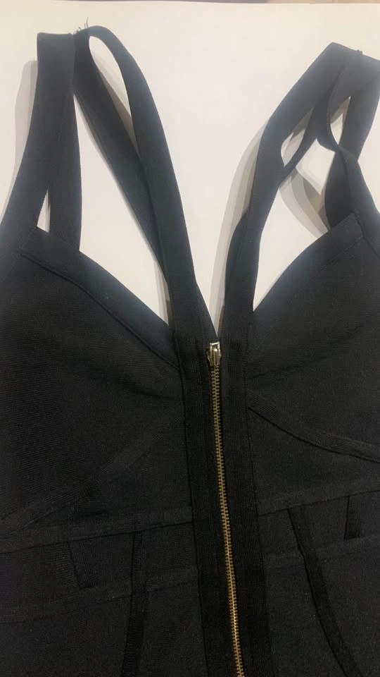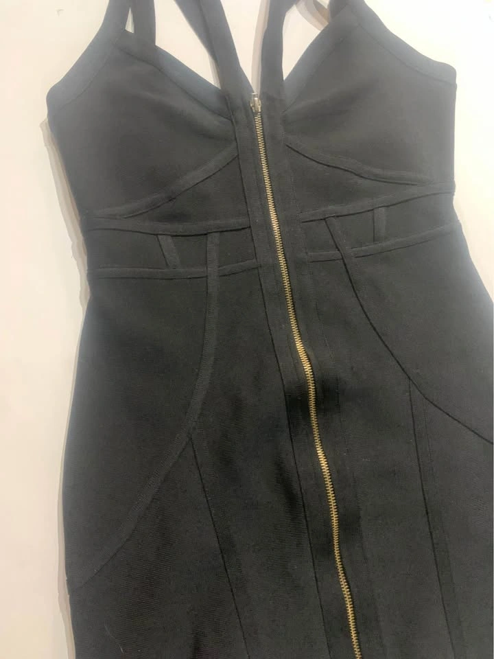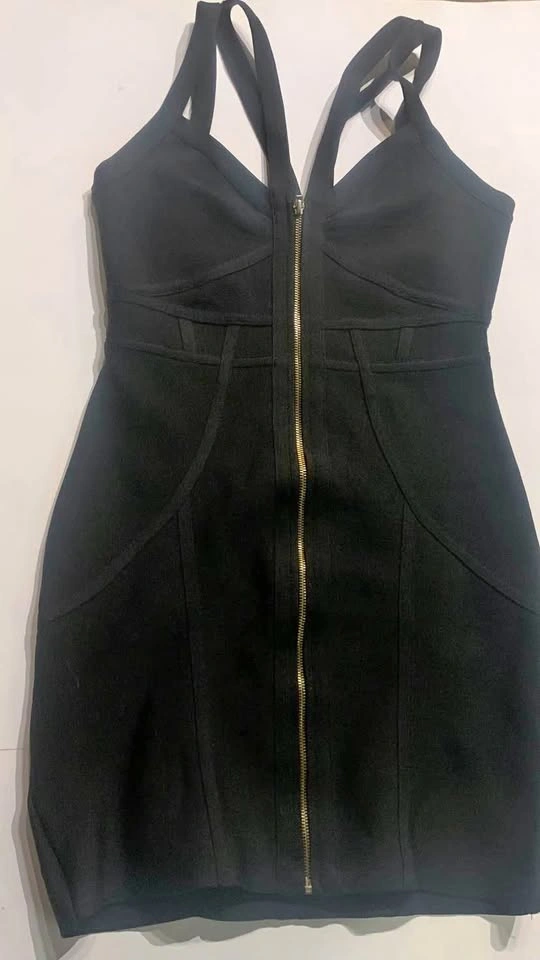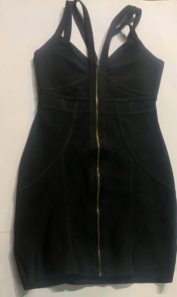 A stunning black mini dress with a form-fitting, bandage-style construction that accentuates your figure. The dress features a full-length gold zipper in the front, and stylish double straps. The perfect statement piece for a night out or special occasion. Excellent, gently used condition.