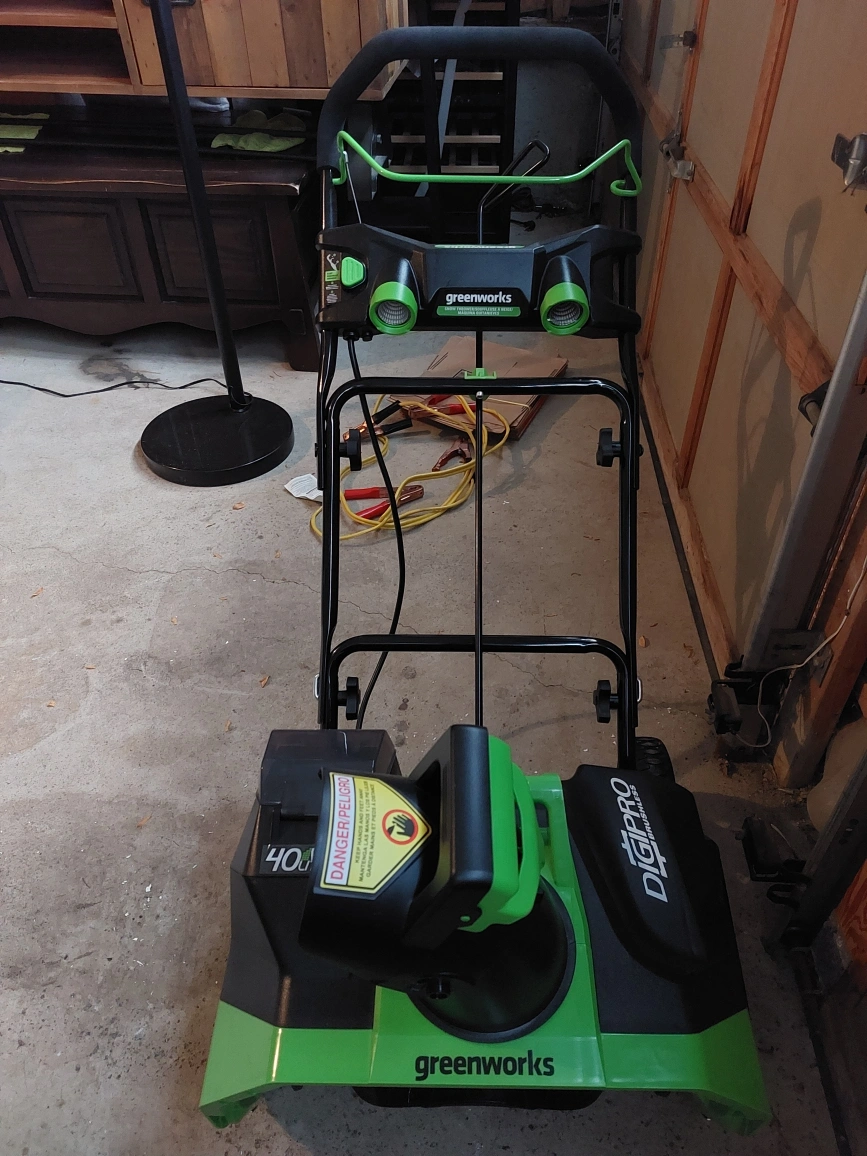 87Selling a Greenworks 40V cordless snow shovel. It's in great shape and ready to help you clear the snow this winter! Features the DigiPro brushless motor for efficient power and performance. If you have other greenworks equipment - this is for you. Needs a 40v lithium battery - ~$100, great if you can share the battery with a few tools.