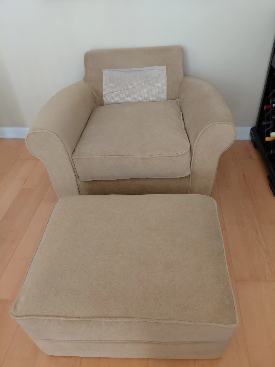 Selling a comfy armchair with a matching ottoman! It's in great shape and would be perfect for a reading nook or living room. The beige colour is neutral and easy to match with any decor. Back pillows needed.