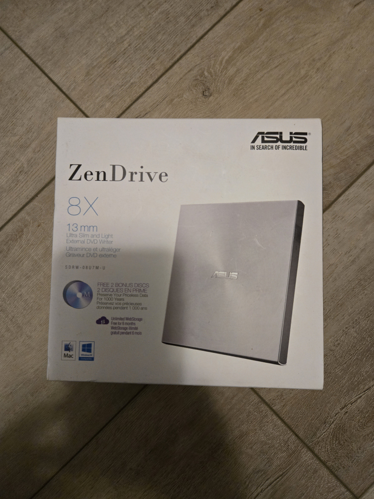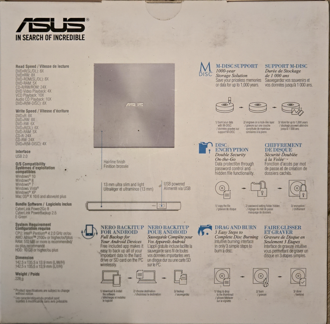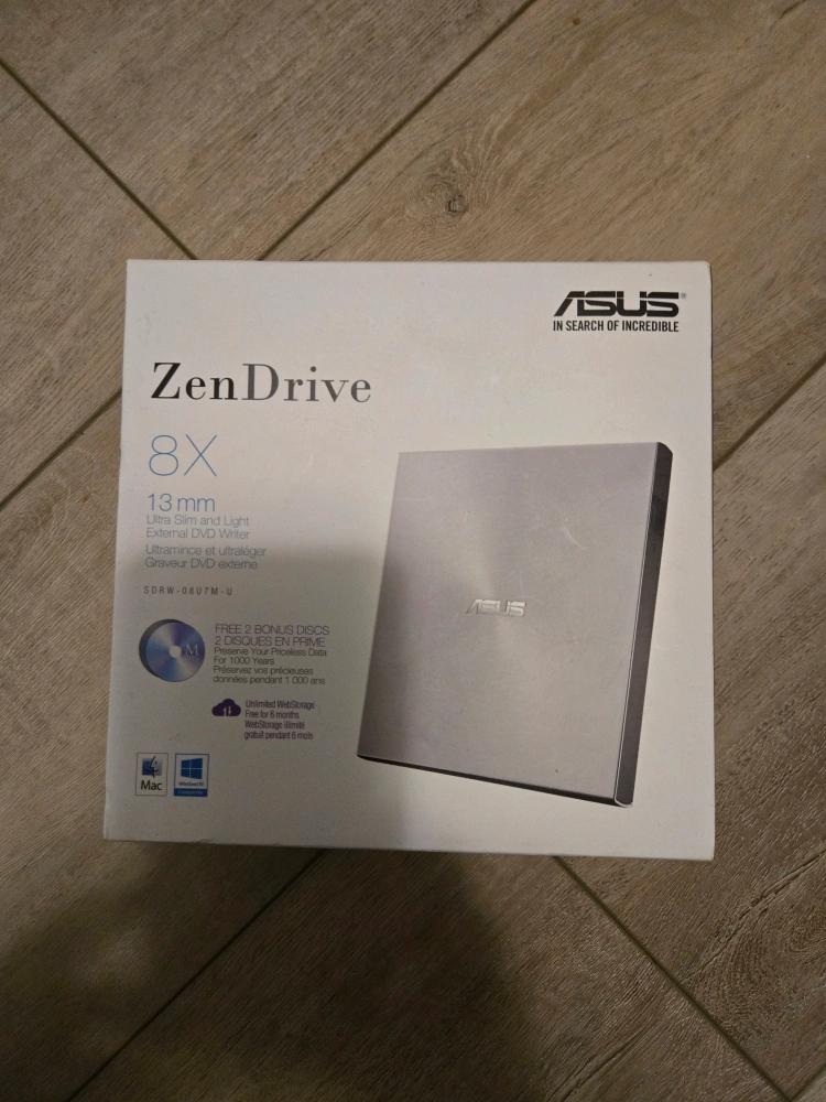 Selling an ASUS ZenDrive 8X External DVD Writer! It's ultra-slim and light, making it super portable. Here are some features: - M-Disc support for 1000-year storage solution - Disc encryption for double security - Drag and burn for easy CD burning Dimensions are 142.5 x 135.5 x 13.9 mm Weight: 228g Comes with 2 bonus discs!
