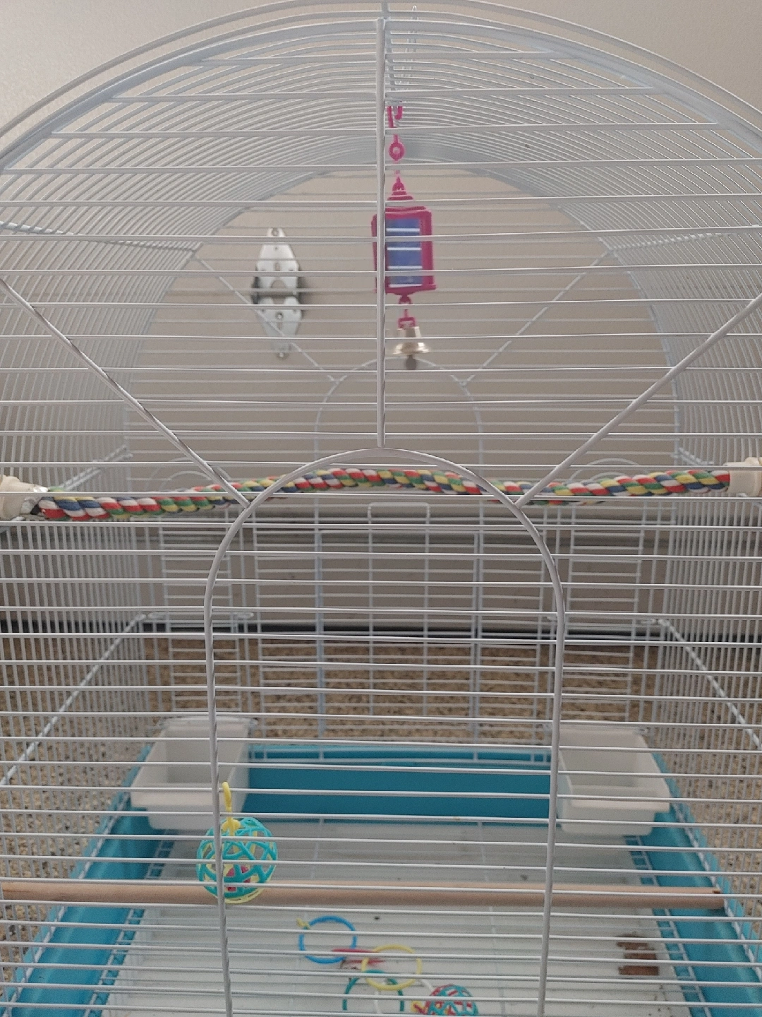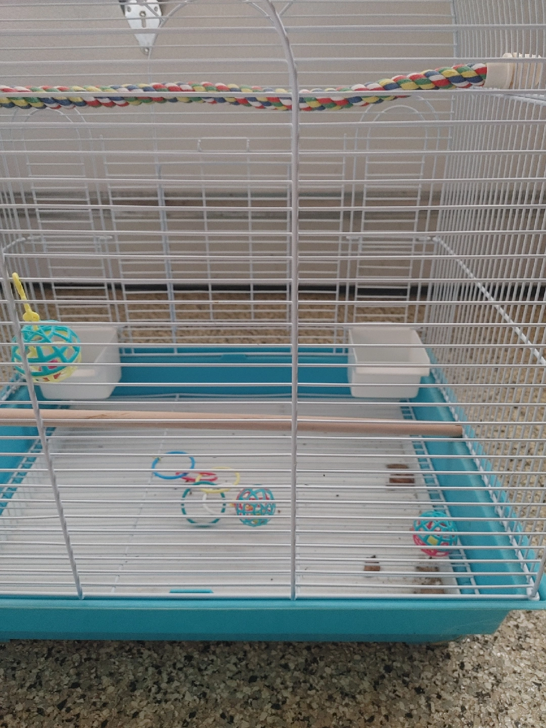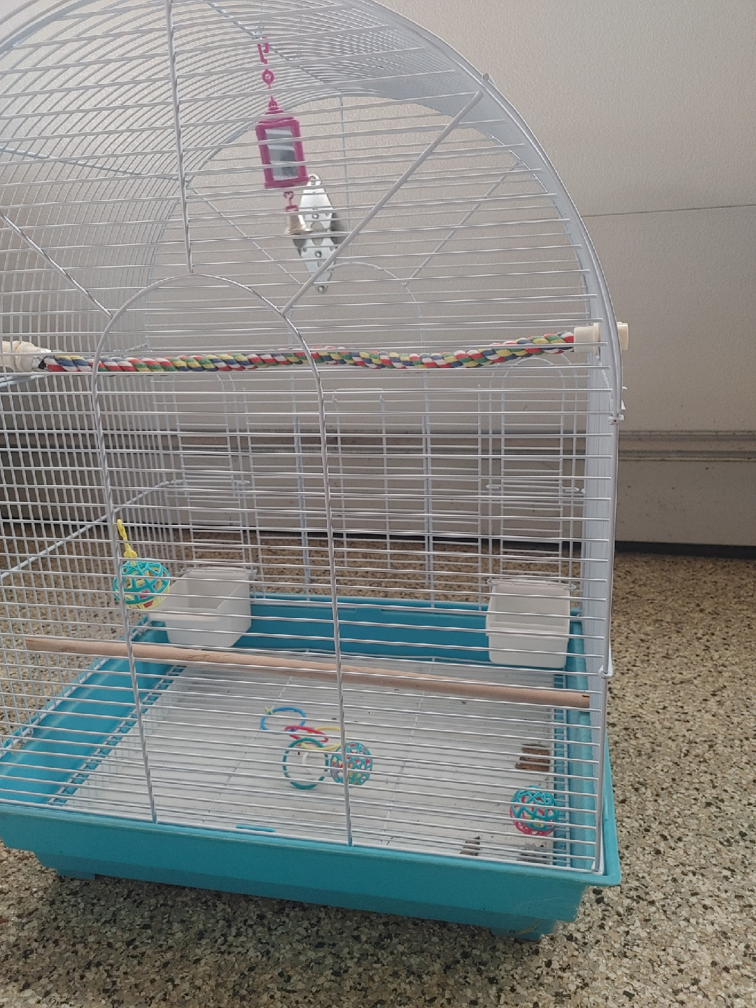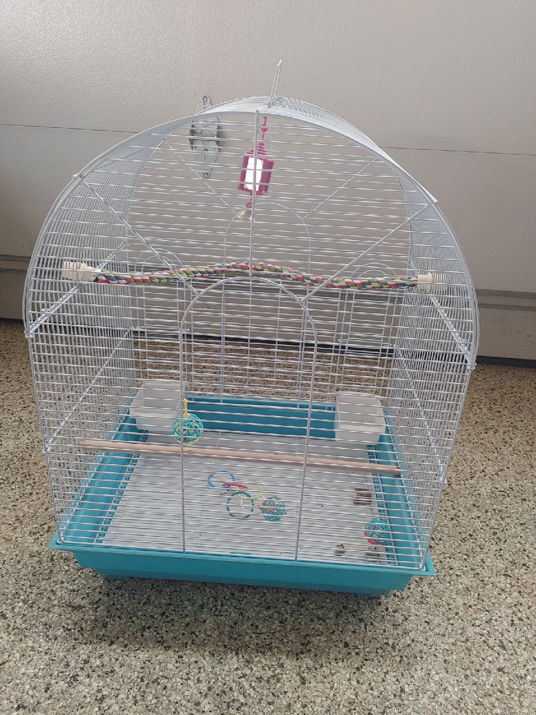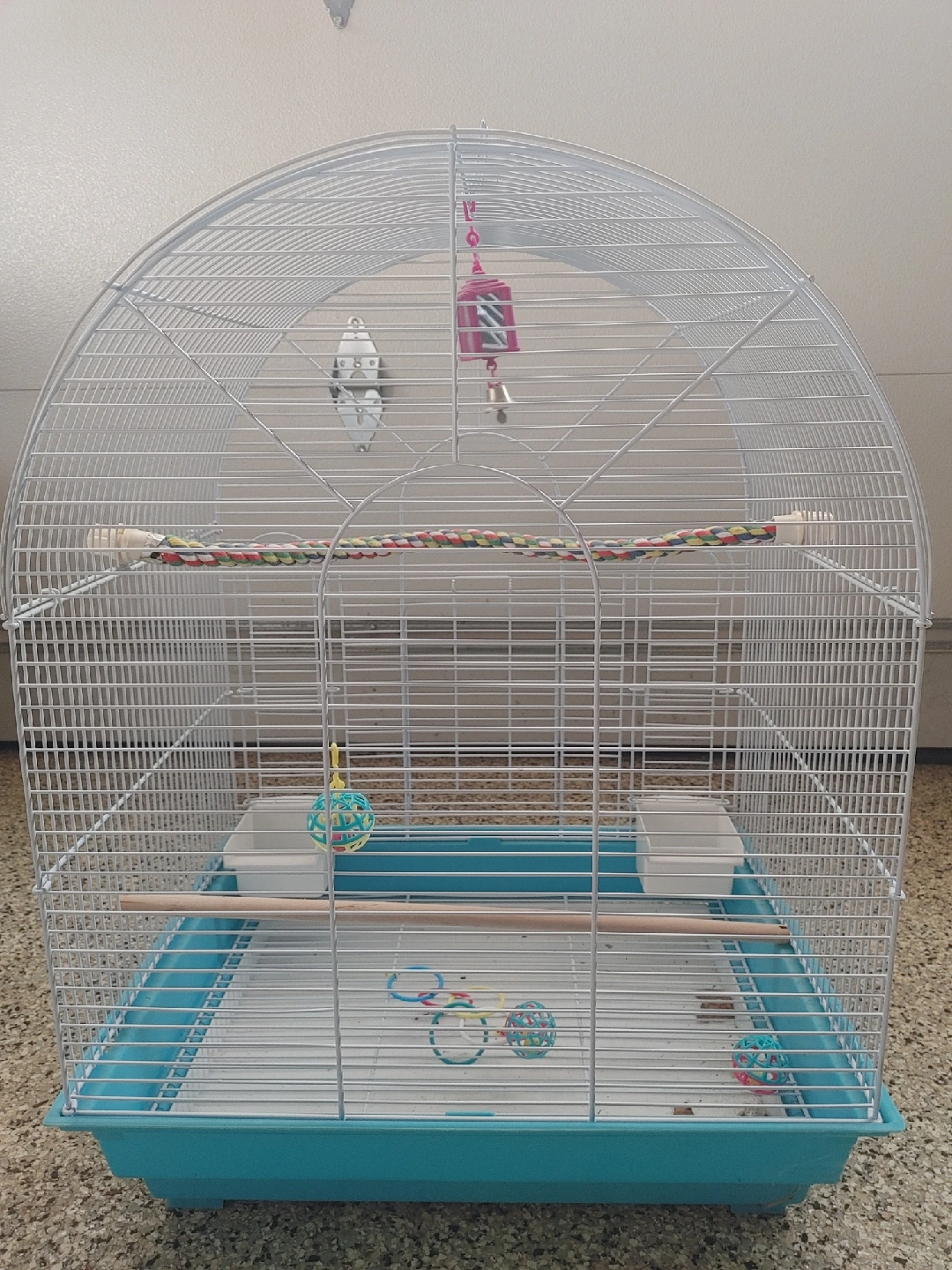 Selling a bird cage with a white wire frame and a turquoise base! It comes with a rope perch, two white food or water dishes, and a few toys. It's in good condition and ready for a new feathered friend