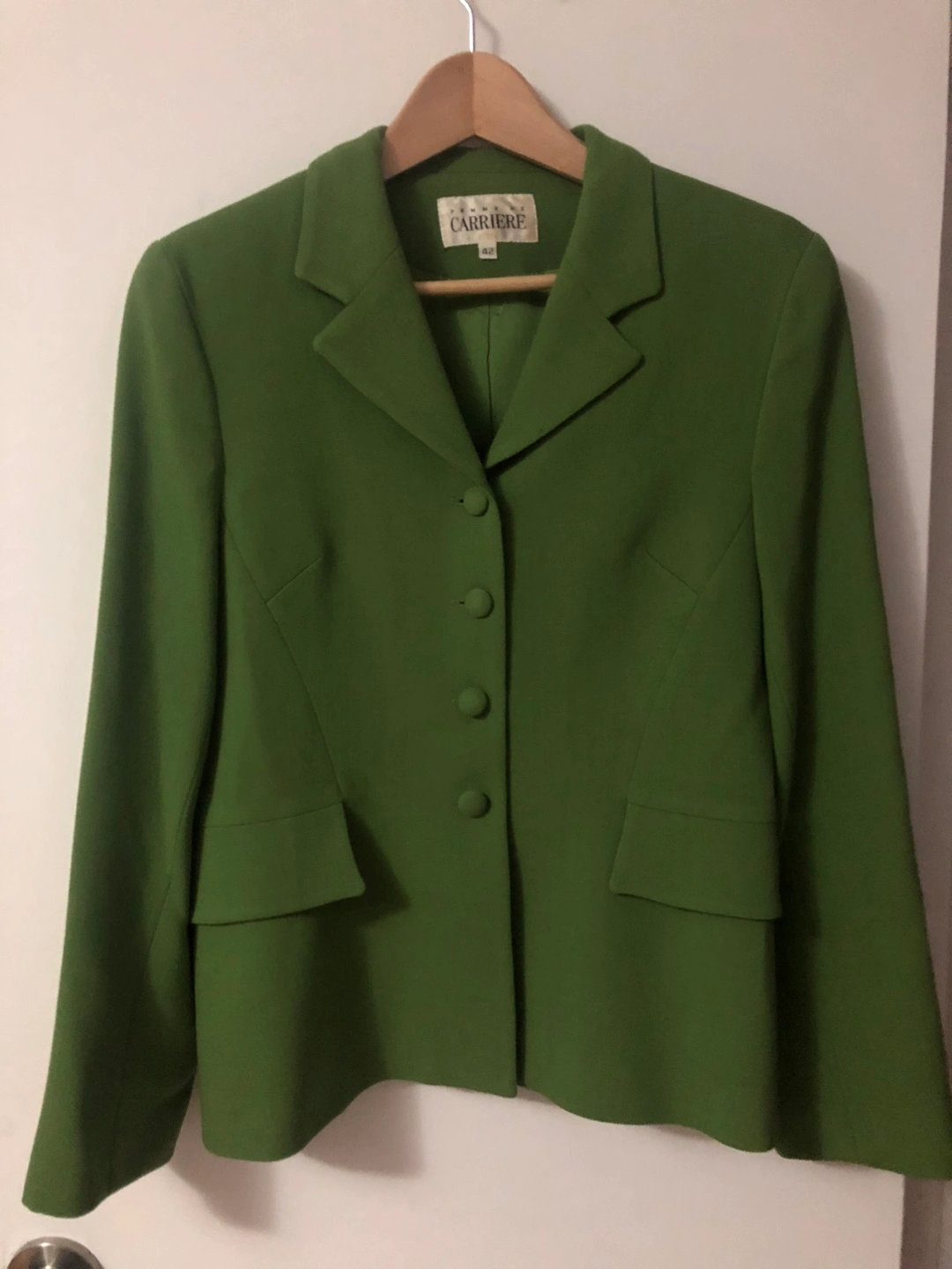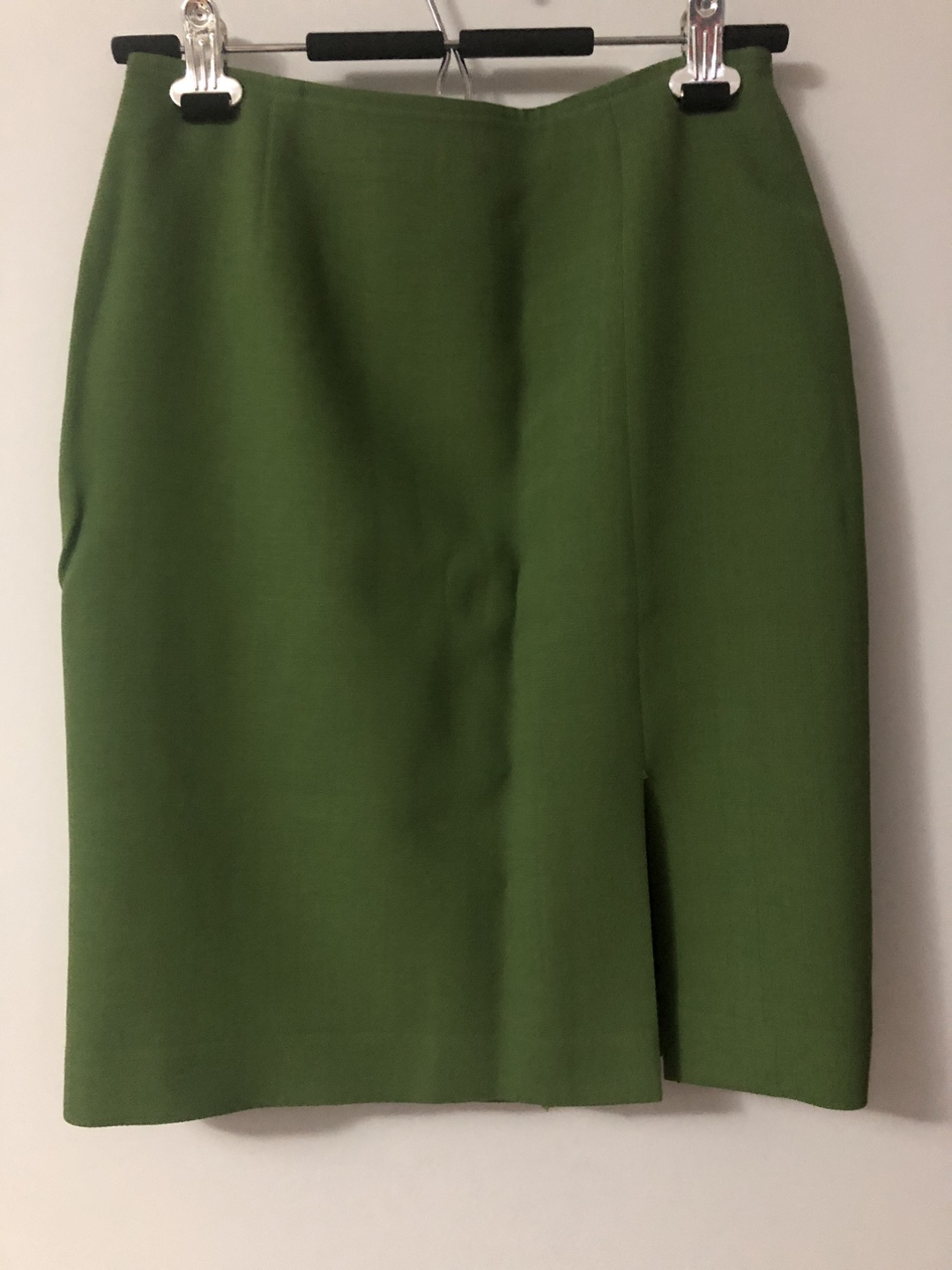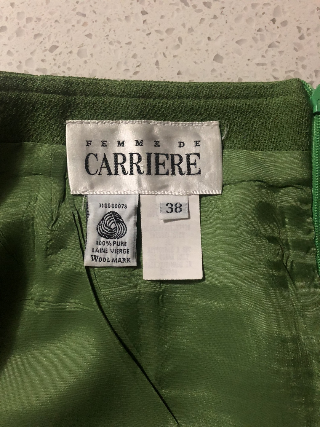 Selling a beautiful Femme De Carriere green wool suit! The jacket is a size 42 and the skirt is a size 38. It's made of 100% pure laine vierge woolmark. Perfect for a professional or stylish look. Excellent condition