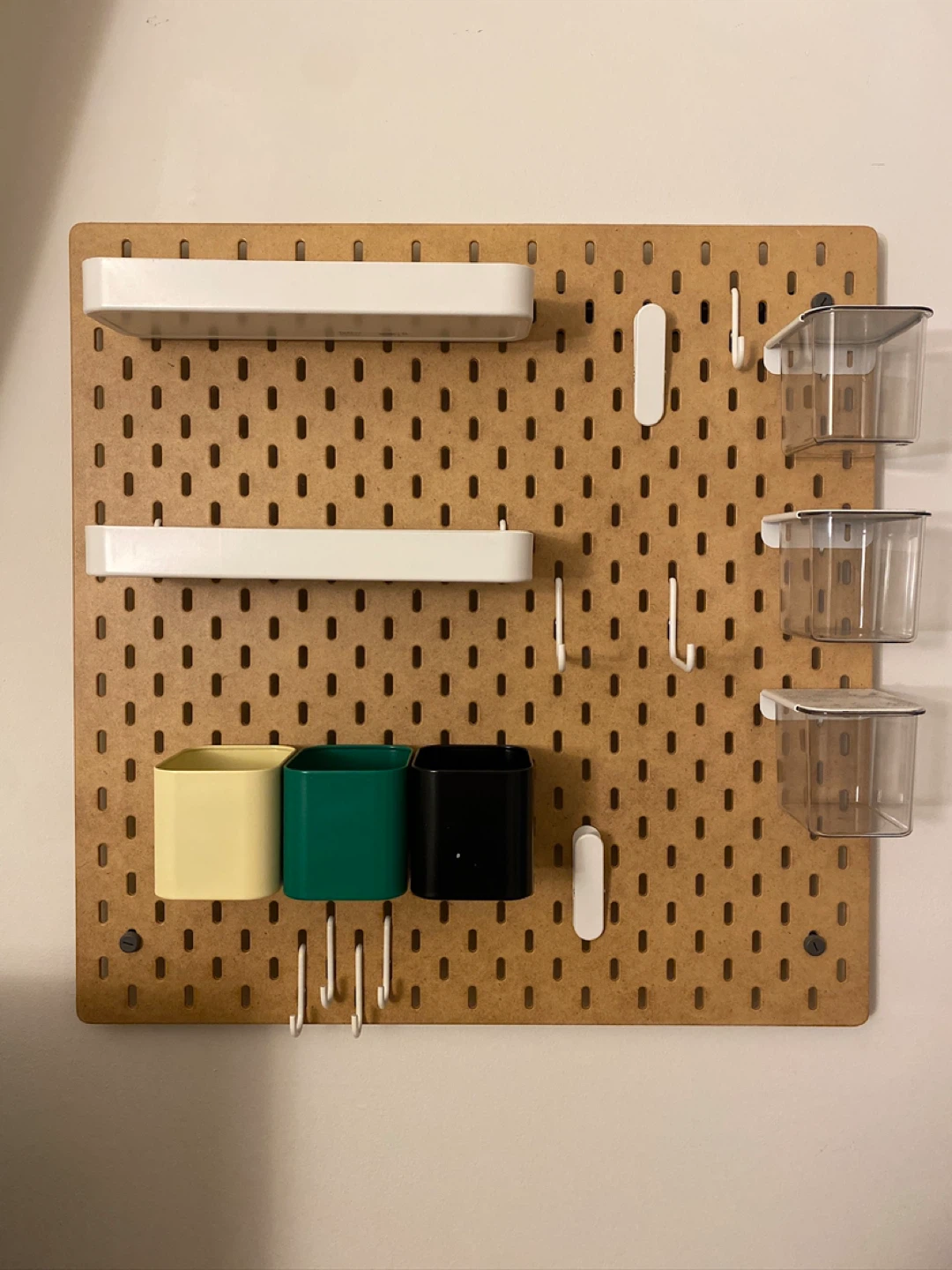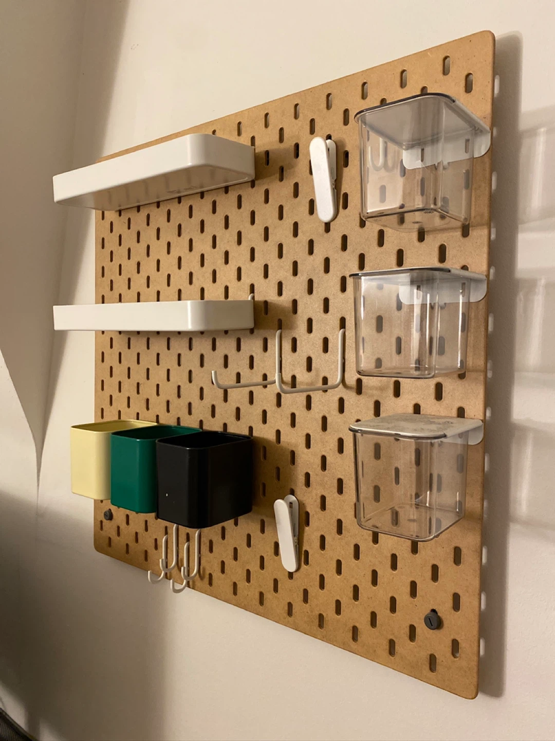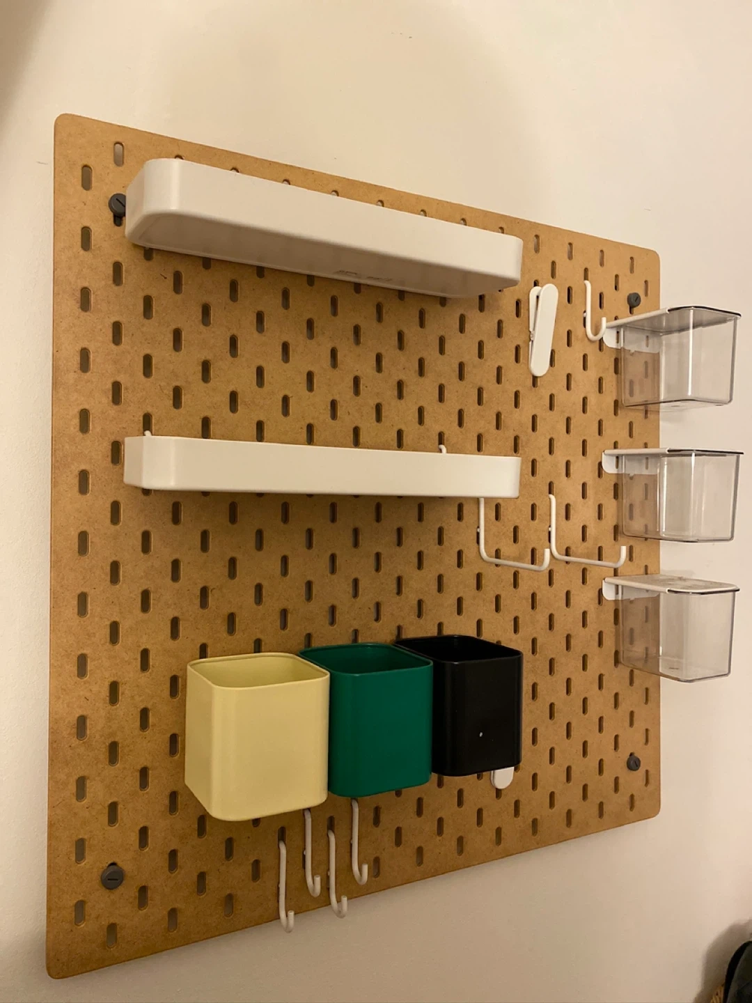 Selling an IKEA Skadis pegboard complete with various accessories. It includes all shelves, containers, and hooks pictures to help you organize your space.