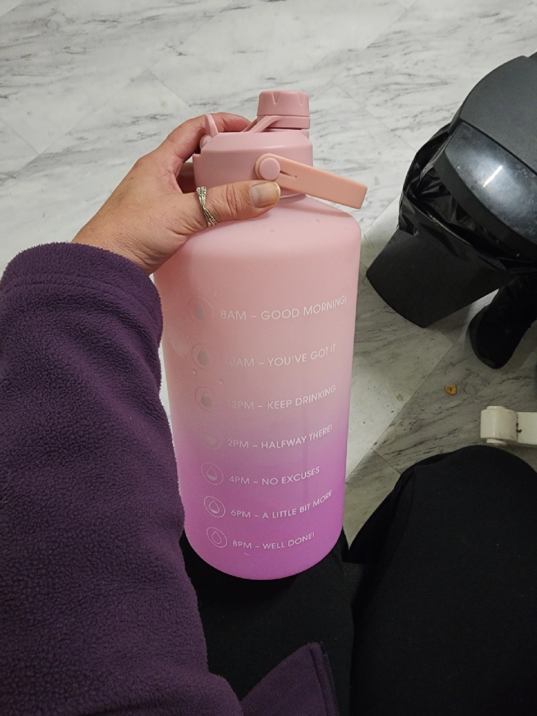 Here's a cute pink ombre water bottle! It has time markings to help you stay hydrated throughout the day. It goes from light pink at the top to a darker purple at the bottom. Perfect for the gym or just keeping at your desk!