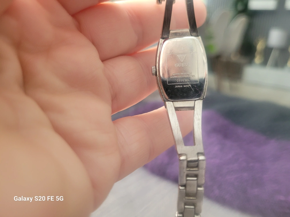 15Selling a Guess ladies' dress watch in silver tone. It's a stylish piece that can dress up any outfit. The watch has a black face and a crystal-accented bezel and band. The model number on the back is G85834L.