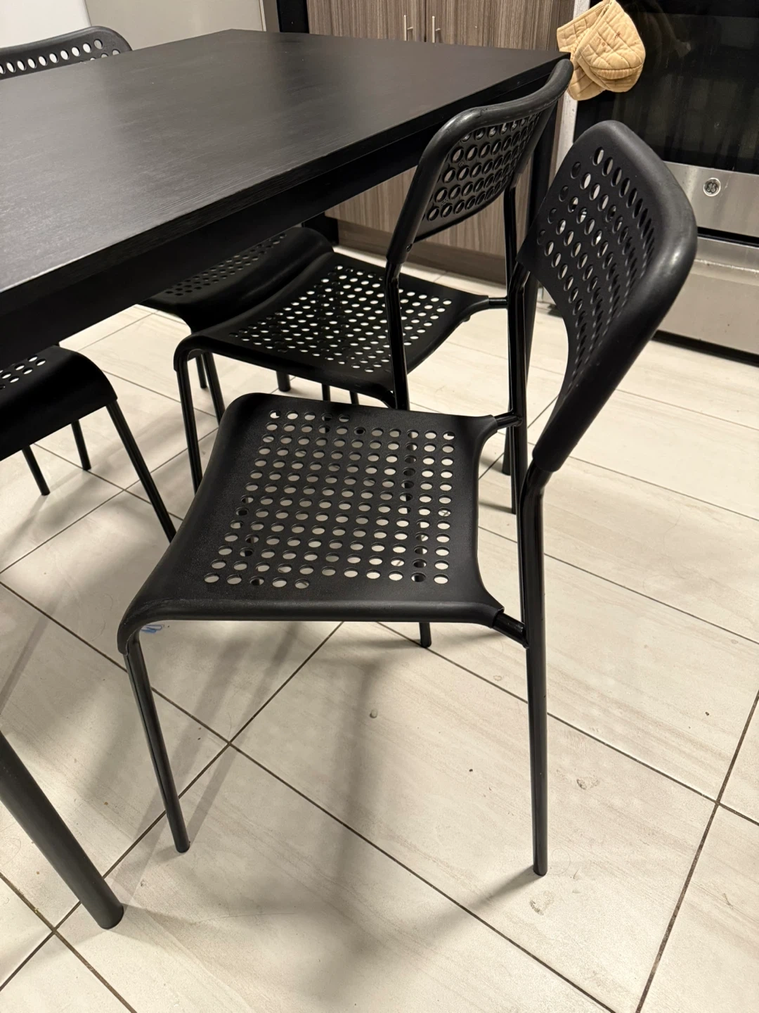 Selling a black IKEA Melltorp table with four Adde chairs. This set is perfect for a small dining area or kitchen. The table and chairs are in good condition and ready for a new home. It's a simple and functional set!