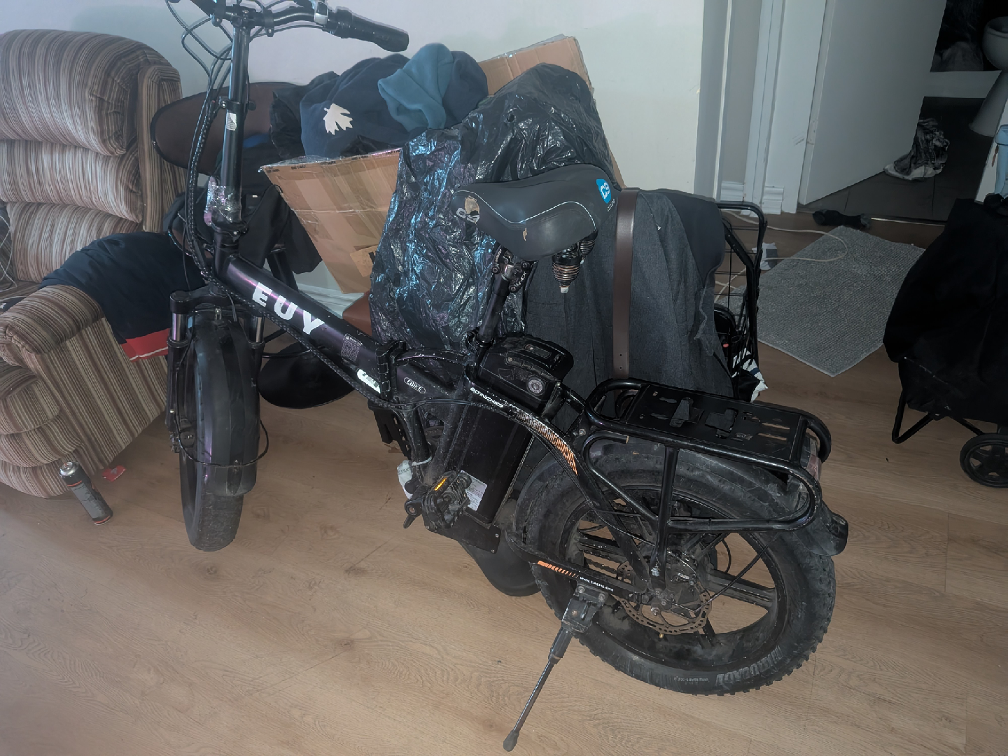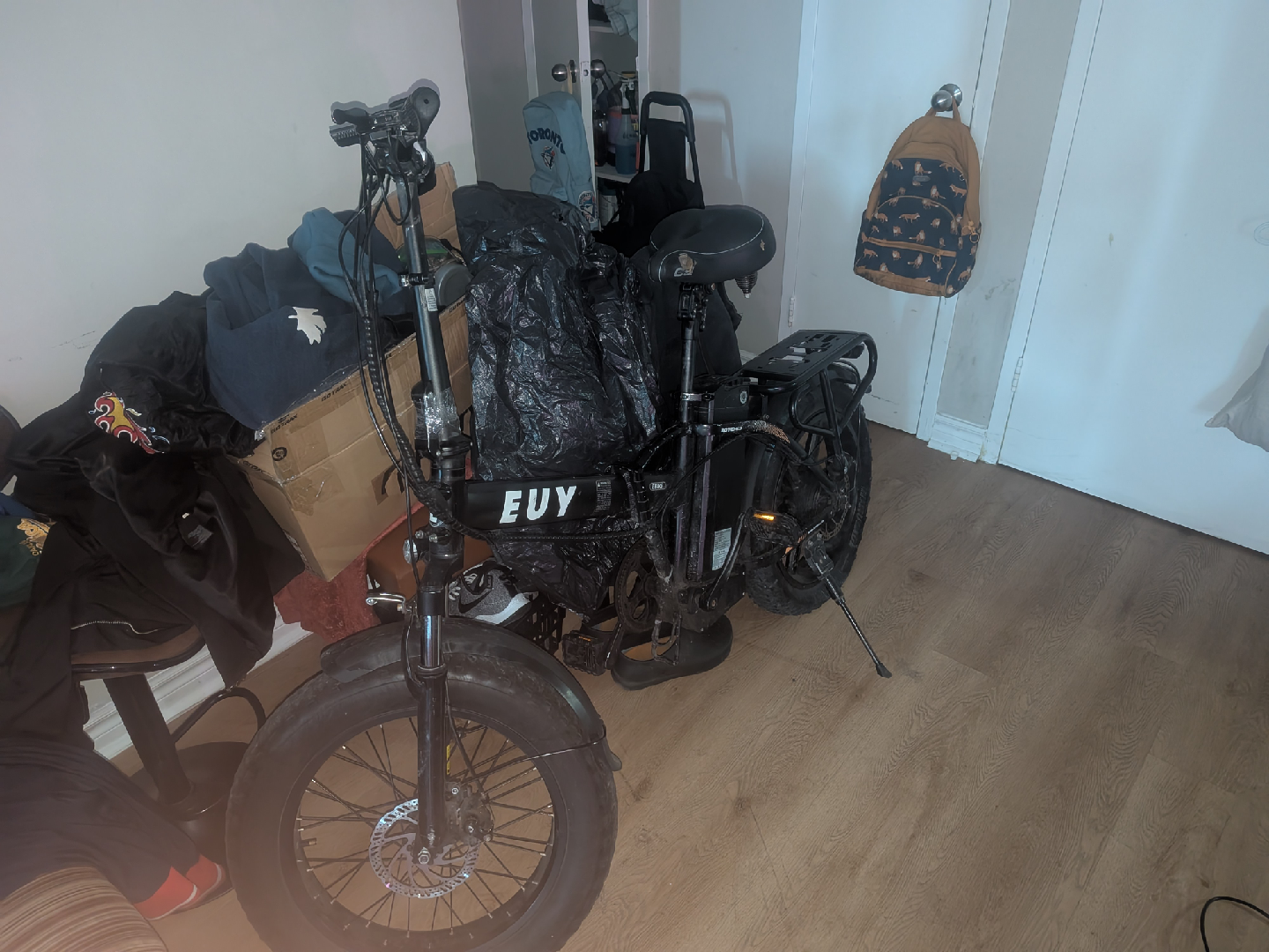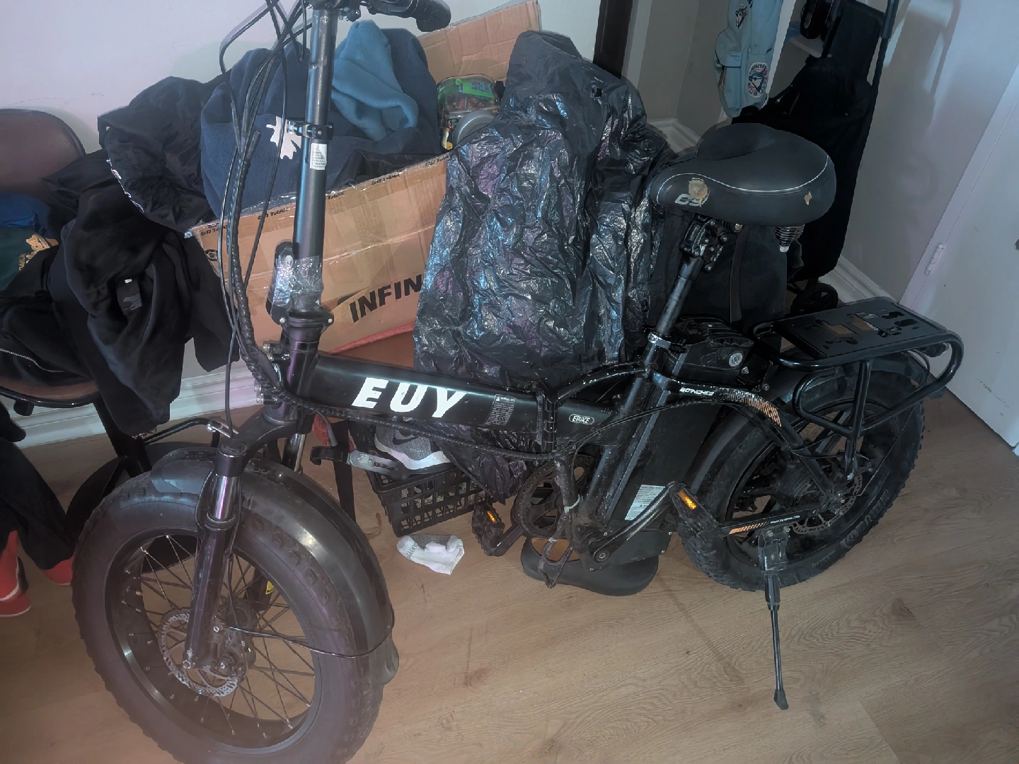 Selling an EUY electric bike. It's black and in good condition. Perfect for getting around town!. 35 / 40 km/hr top speed. . needs a tube(30 bucks), currently you can put in air and ride it no problem, but deflates after a few days. The tire itself is perfect tho. . Great deal