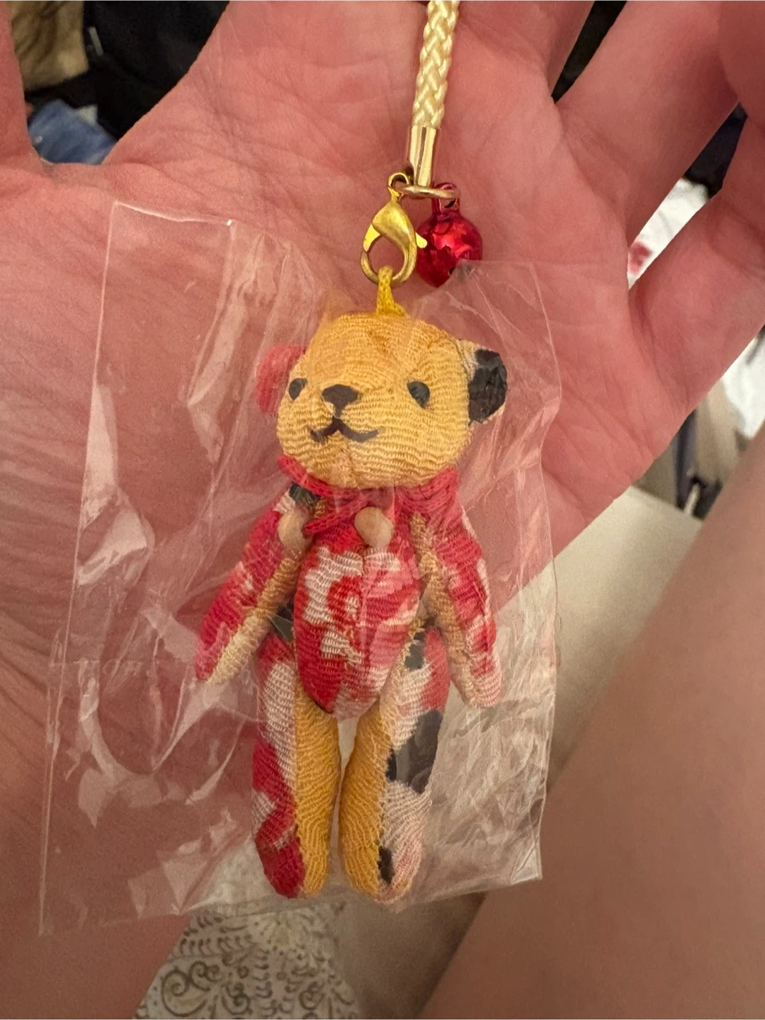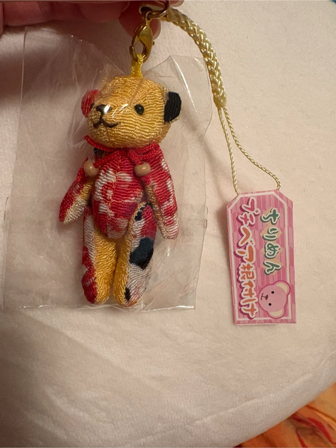 44A cute little bear keychain charm, still in its original packaging! It features a unique fabric design and a small bell accent.