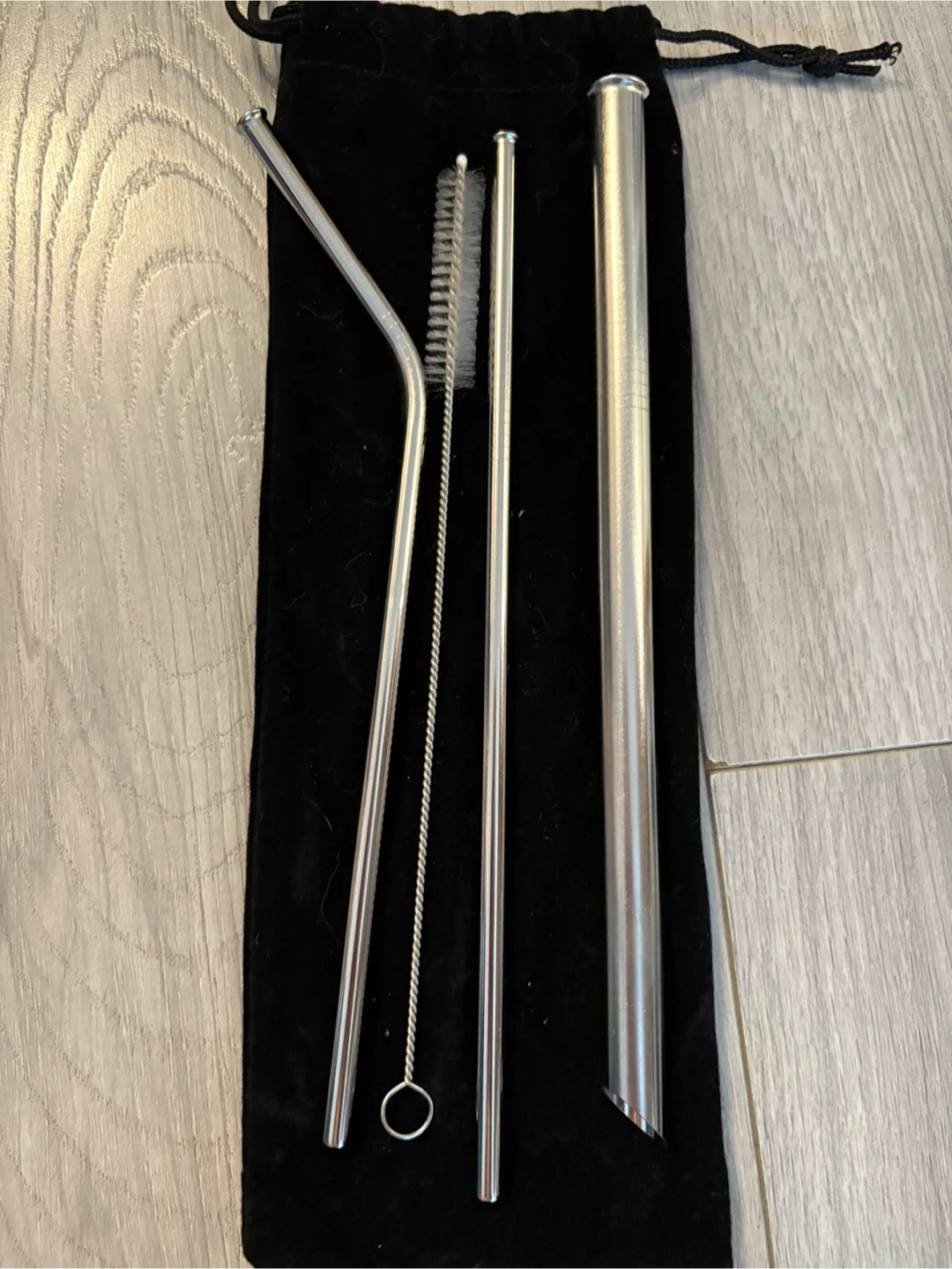 Get your hands on this set of reusable stainless steel straws! It comes with a cleaning brush and a handy carrying pouch, perfect for reducing plastic waste on the go. They are in excellent condition and ready for a new home