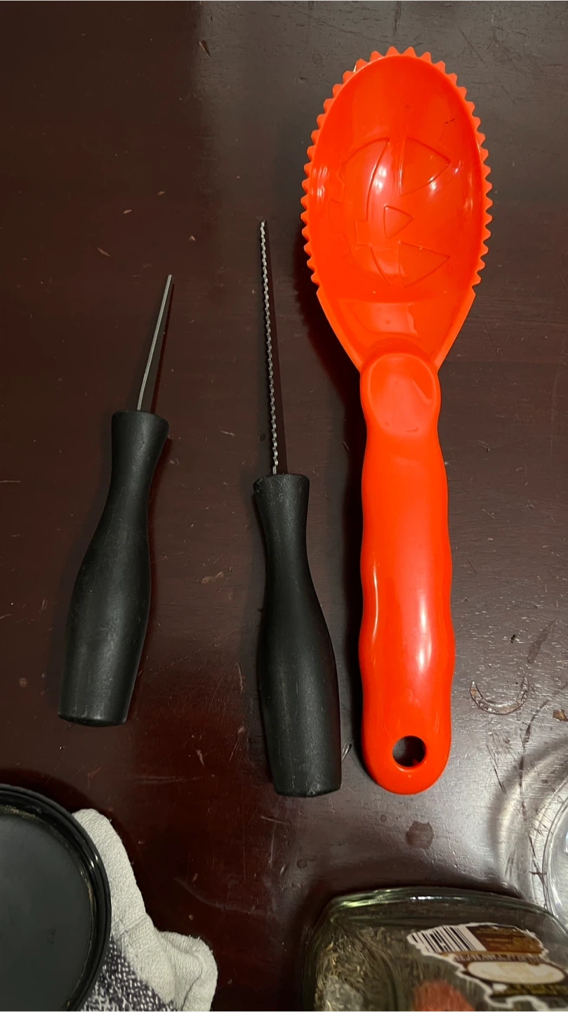 Get ready for Halloween with this pumpkin carving kit! It includes three tools to help you create spooky and fun jack-o'-lanterns. The kit features an orange scoop with a pumpkin design and two carving tools with black handles. Perfect for all your pumpkin carving needs!