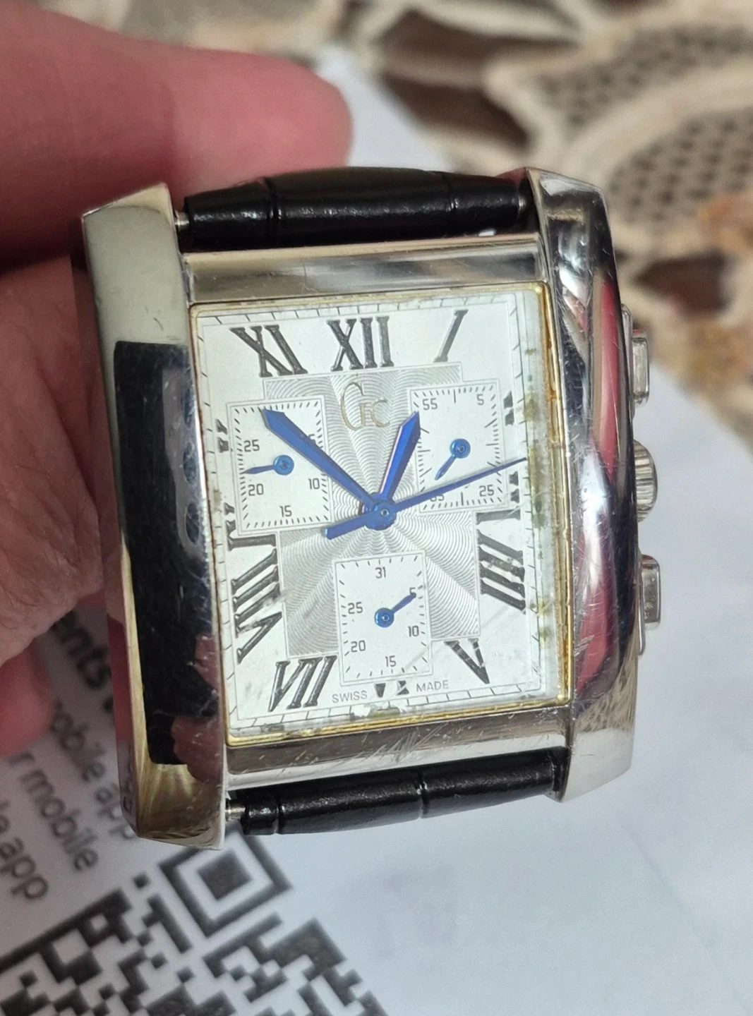 Selling a Guess Collection GC20000 watch. It has a black leather strap and a silver-tone case. The watch face features Roman numerals and chronograph subdials. It's water resistant to 50 meters / 165 feet and Swiss made.