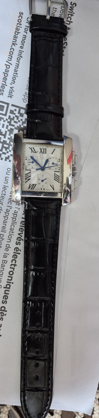 Selling a Guess Collection GC20000 watch. It has a black leather strap and a silver-tone case. The watch face features Roman numerals and chronograph subdials. It's water resistant to 50 meters / 165 feet and Swiss made.