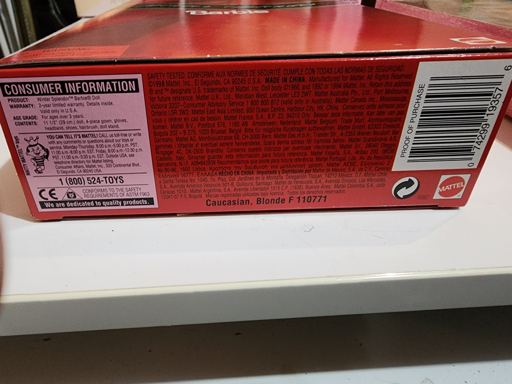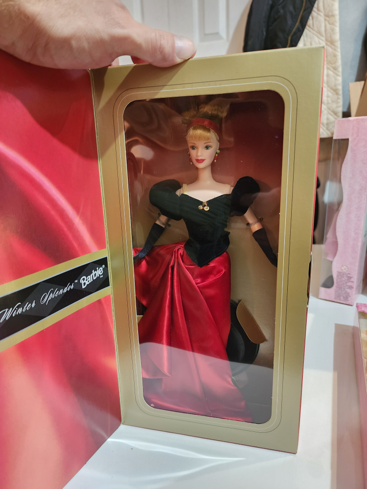 This special edition 1996 Winter Splendor Barbie doll, an Avon exclusive, is a collector's dream, showcasing a beautiful design with a red and black gown, and is new in box.