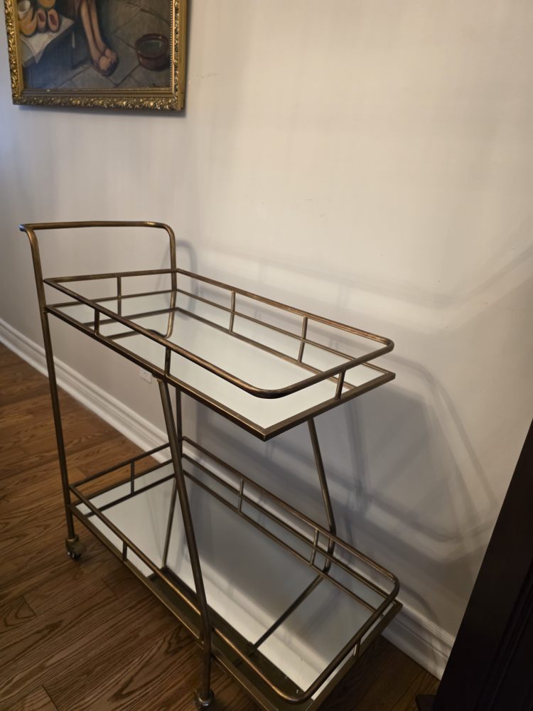 Selling a stylish rolling bar cart! It features a gold-tone metal frame and two glass shelves, perfect for displaying your favourite drinks and barware. It's in great shape and ready to add a touch of elegance to your home