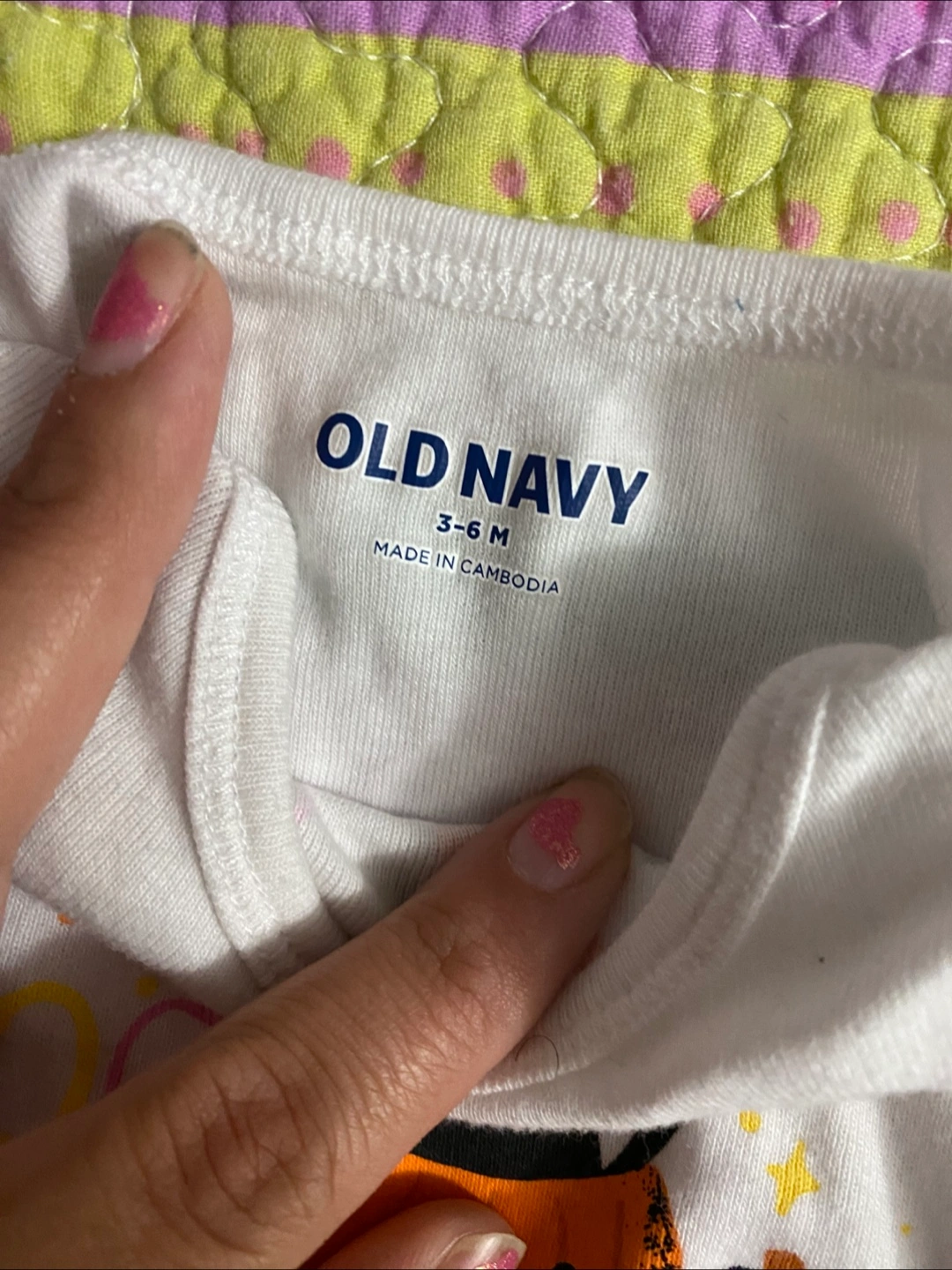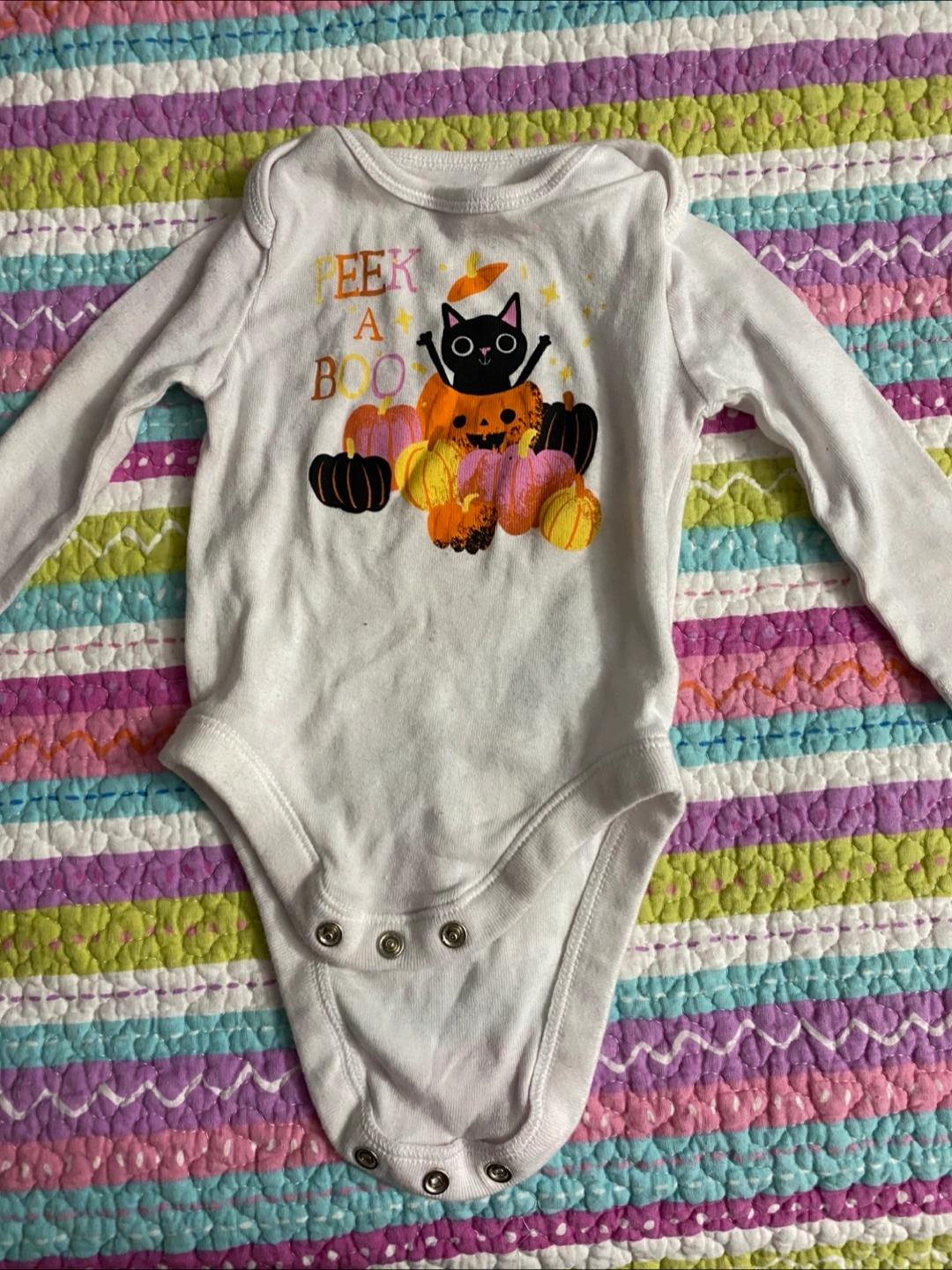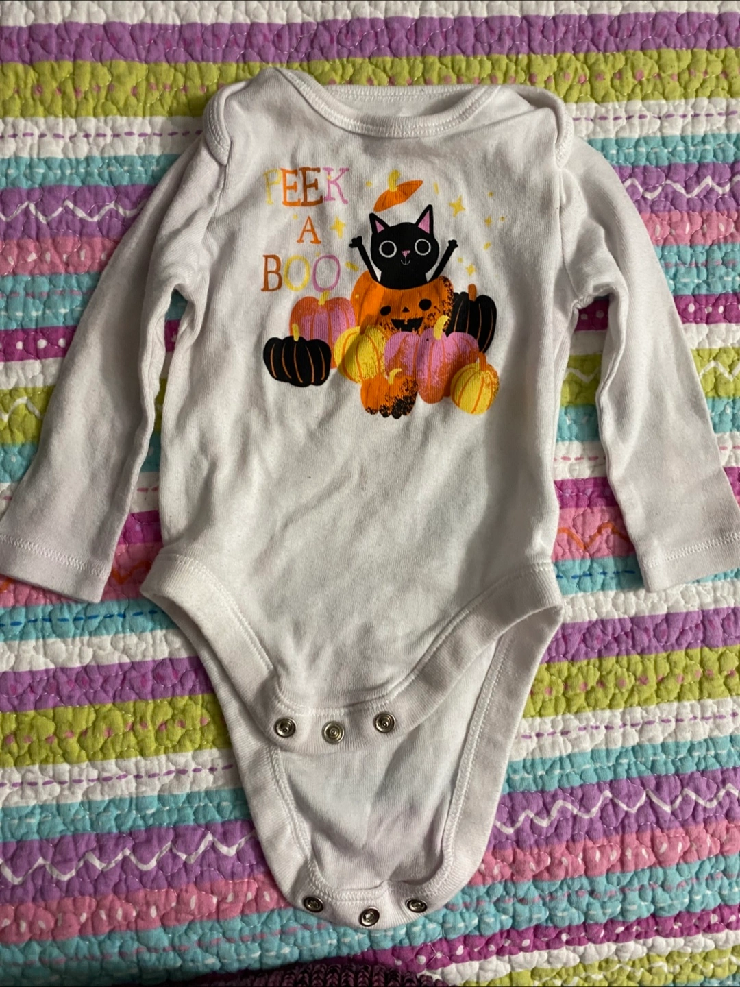 10Super cute Old Navy Halloween-themed onesie for your little one! It's white with a fun 'Peek a Boo' design featuring a black cat and pumpkins. Size is 3-6 months