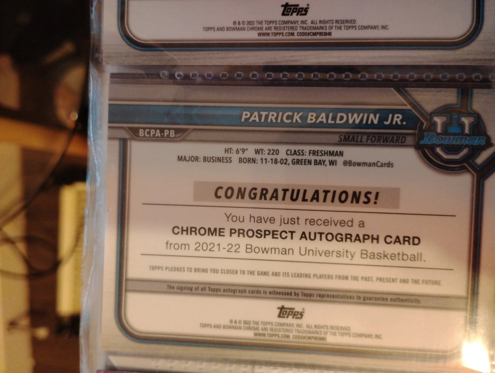 Selling a Patrick Baldwin Jr. Chrome Prospect Autograph Card from the 2021-22 Bowman University Basketball series! It's a Topps certified autograph issue and features Patrick Baldwin Jr. as a small forward