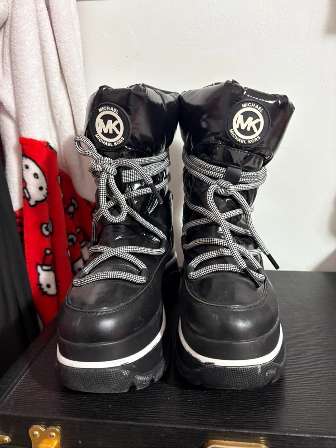 Selling a pair of Michael Kors winter boots in black! They have a stylish and functional design, perfect for keeping your feet warm and dry during the colder months. They show some signs of wear on the soles, but the uppers are in great shape. These boots are sure to make a statement!
