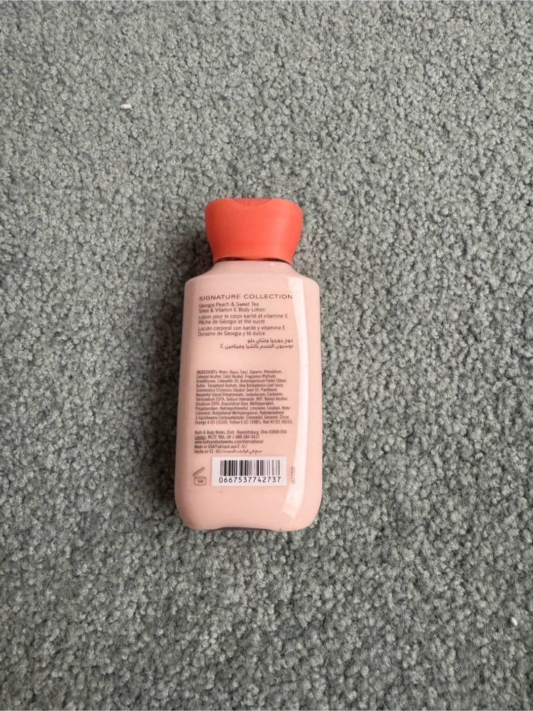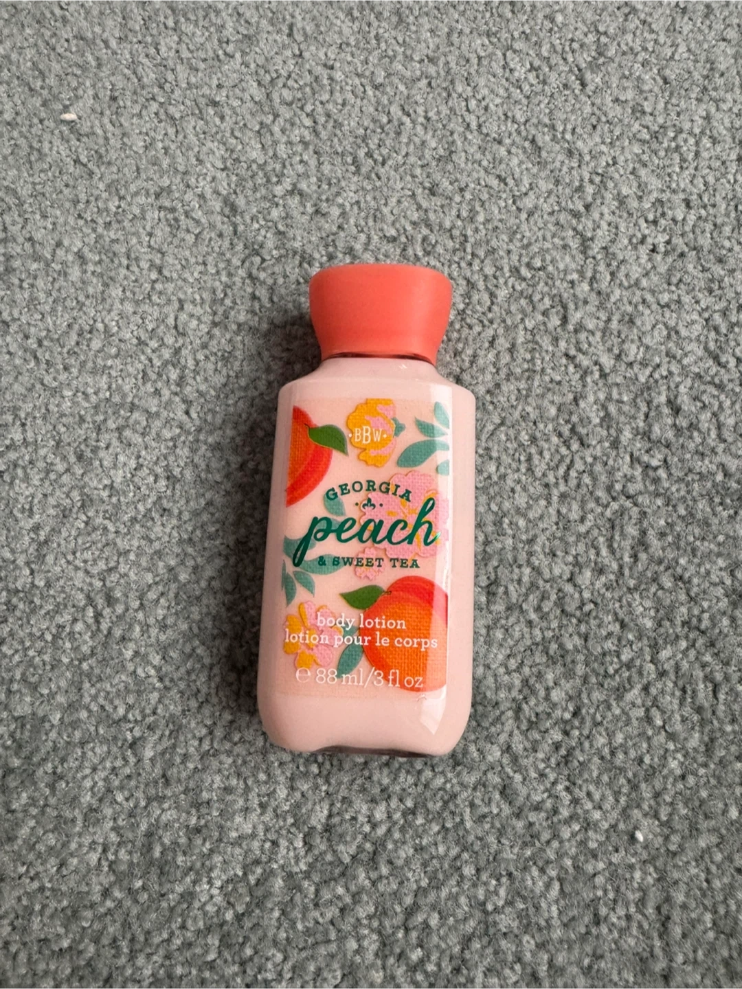 Selling a brand new Bath & Body Works Georgia Peach & Sweet Tea body lotion. It's an 88 mL / 3 fl oz bottle. Perfect for on the go