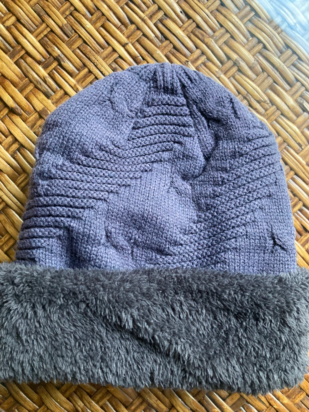 Cozy grey knit beanie with fleece lining. New and unworn. Perfect for keeping warm this winter! It has a soft, furry lining for extra comfort on those chilly days.