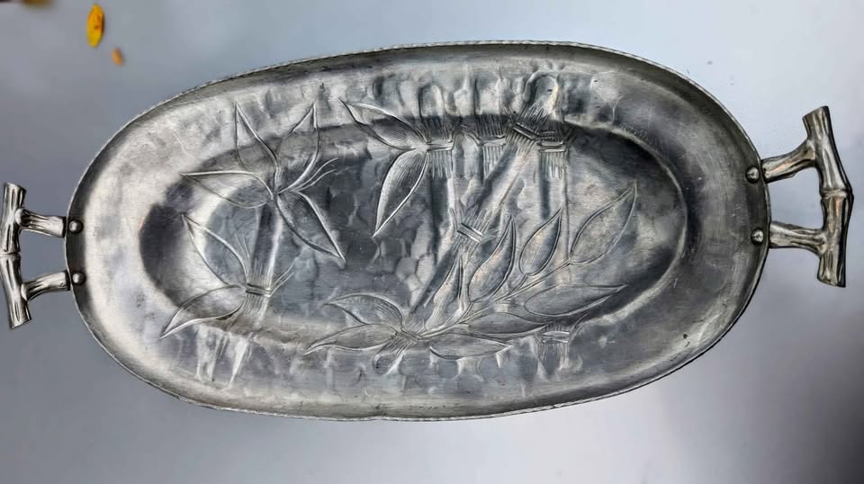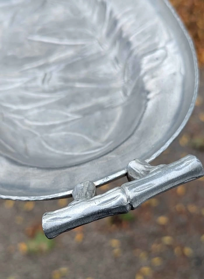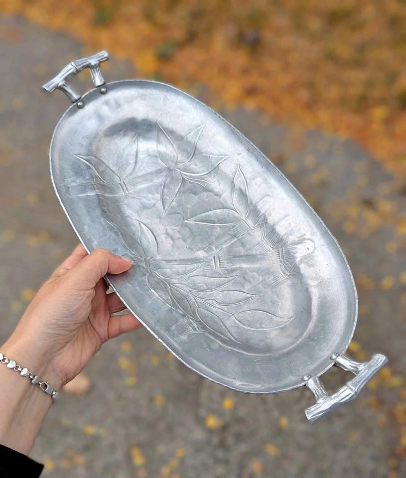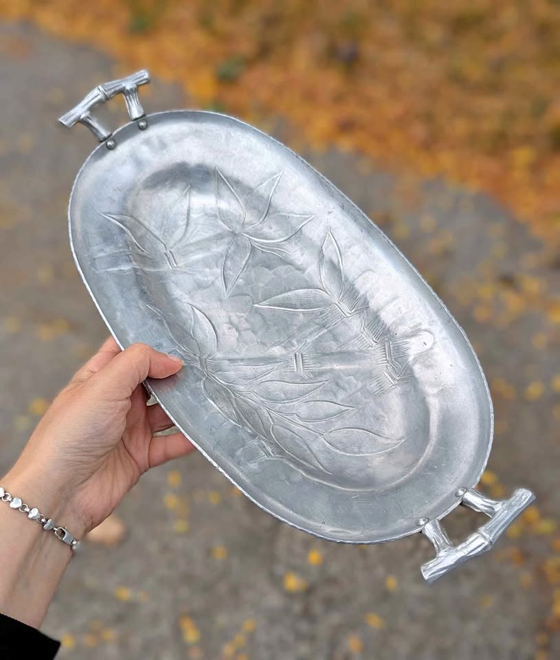 Lovely vintage Everlast Forged Aluminum serving tray featuring a hand-hammered texture and raised bamboo and leaf motif. The tray has elegant bamboo-style handles and the original Everlast Forged Aluminum hallmark on the underside.