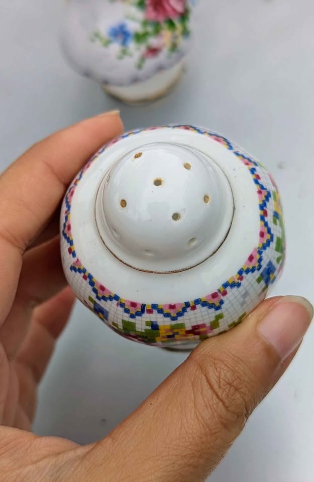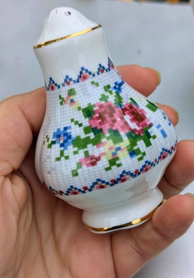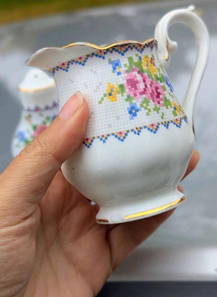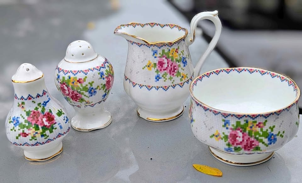 This lovely 4-piece set features a cross-stitch–style floral pattern with gold trim.