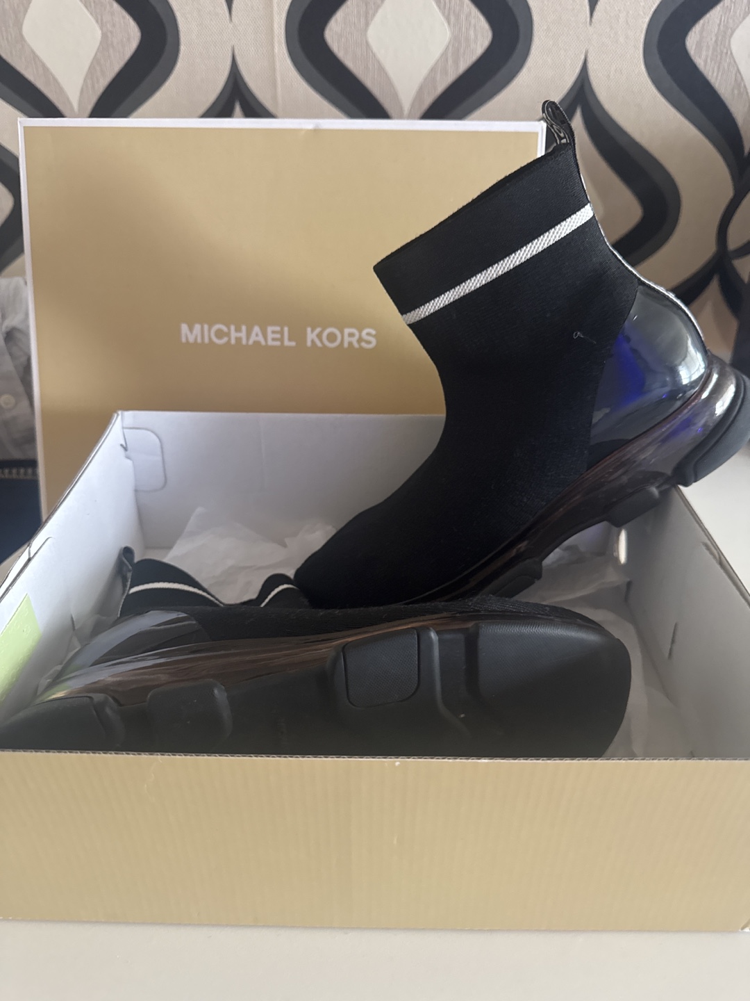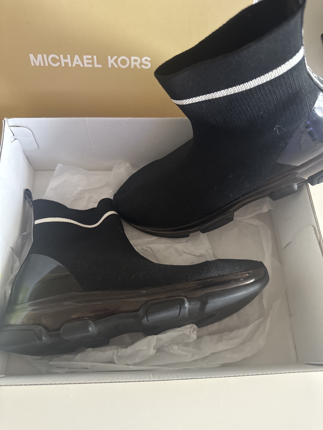 Selling a pair of Michael Kors women's sneakers in black. They are in great condition and come with the original box. Stylish and comfortable!