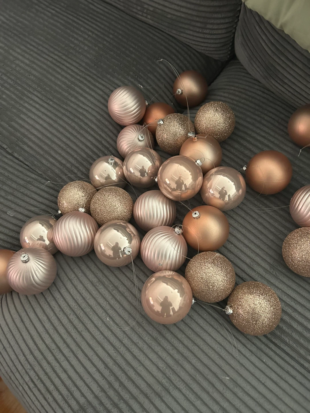 Selling a set of rose gold Christmas ornaments! They come in a variety of textures and finishes, including shiny, ribbed, and glittery. They're perfect for adding a touch of elegance to your Christmas tree this year