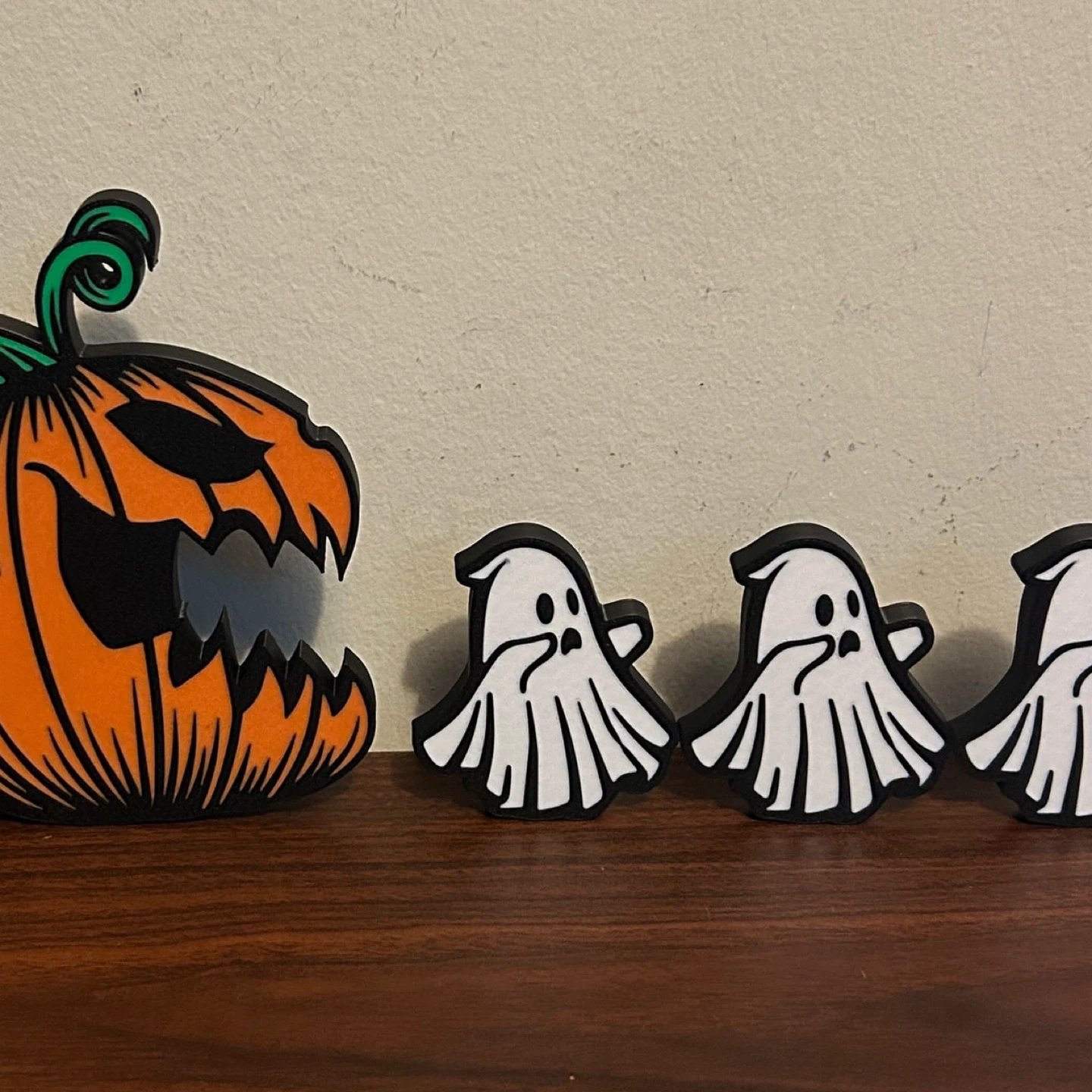 Cute Halloween decorations featuring a pumpkin chasing 3 terrified ghosts. Perfect for adding a playful and spooky touch to your home this October.