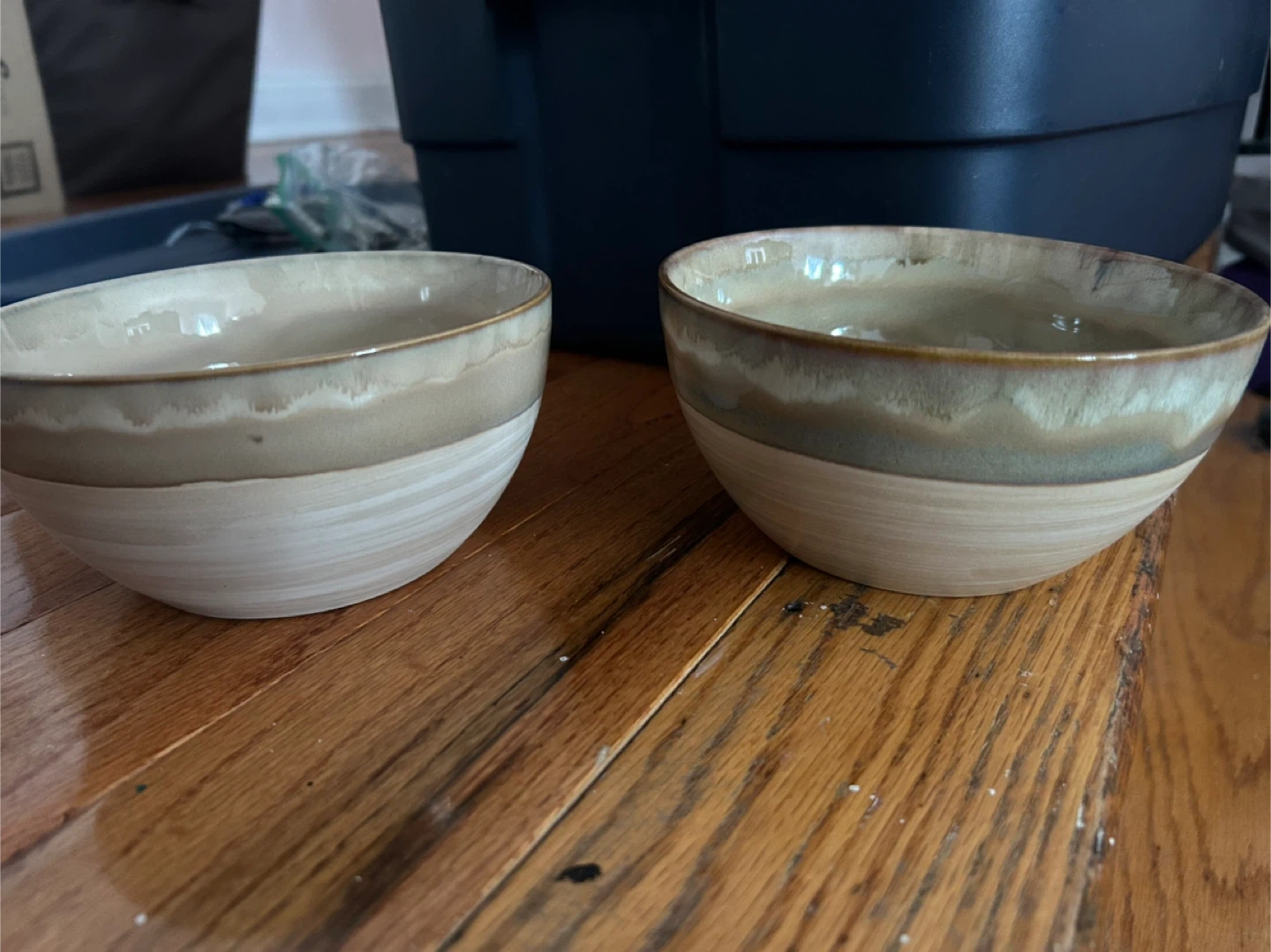 Selling a set of two ceramic bowls with a two-tone design. They have a neutral color palette that would fit in any kitchen. These bowls are in good condition and ready for a new home!