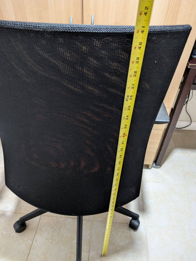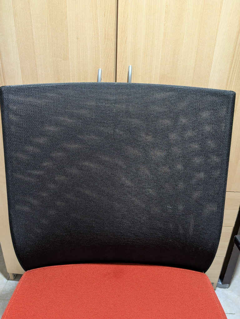 Office chair with an red orange fabric seat and a black mesh back. Great for your home office or study space! It's in good condition and ready for a new home. Dimension are on the photos... No damages, hydraulics are in good condition...