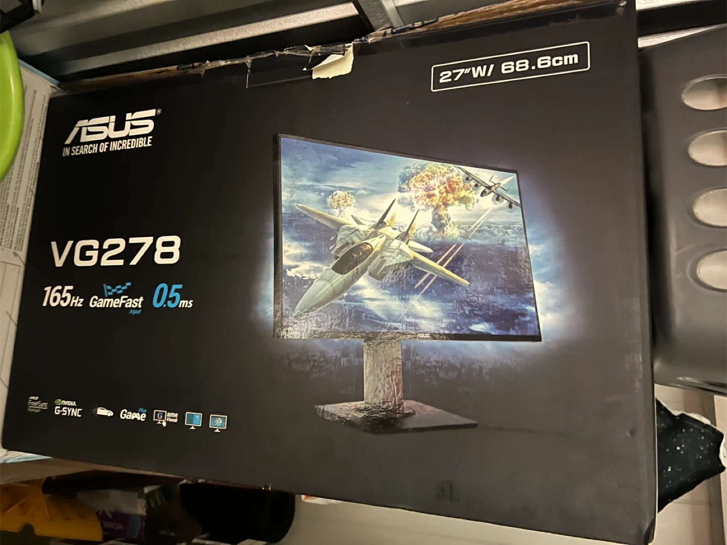 Selling an ASUS VG278 gaming monitor. It's a 27-inch monitor, perfect for immersive gaming experiences. Features include a 165Hz refresh rate and GameFast Input with a 0.5ms response time for smooth visuals. The monitor is also NVIDIA G-SYNC compatible. Box included!