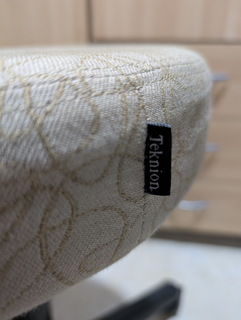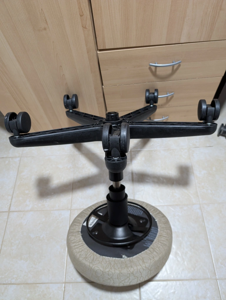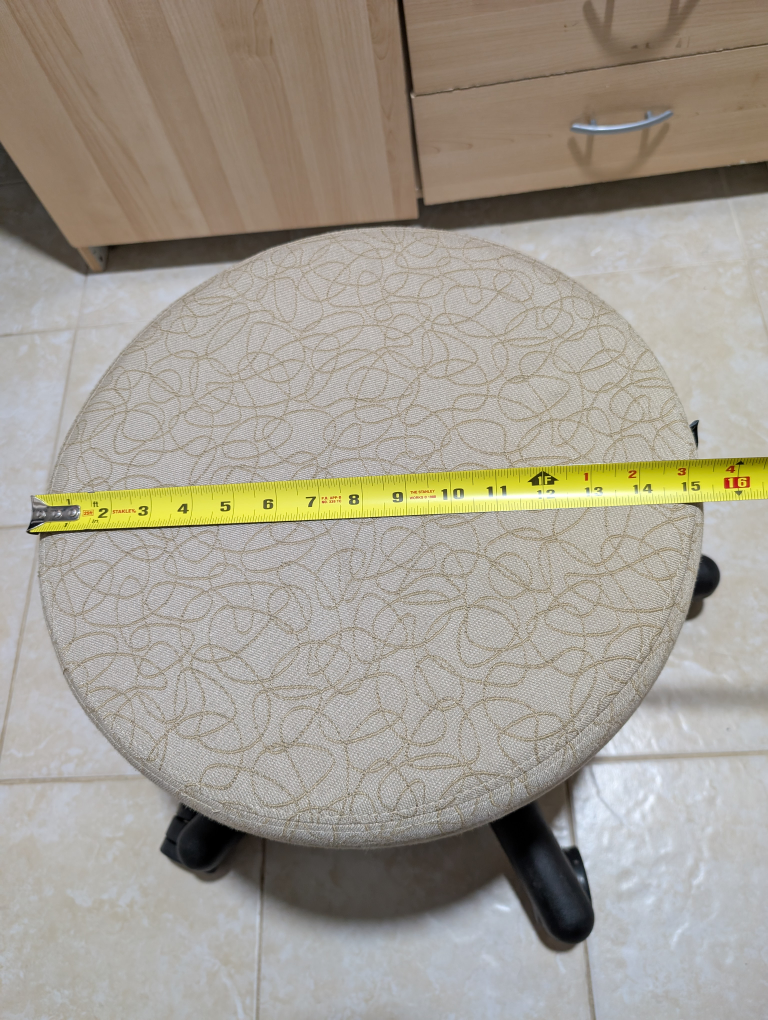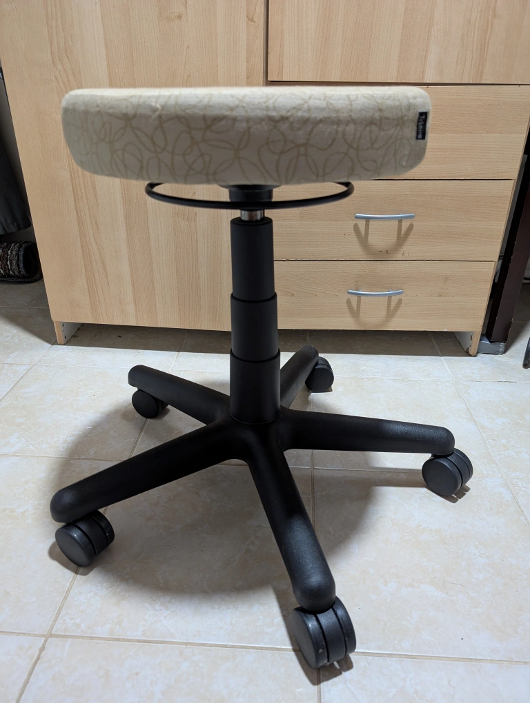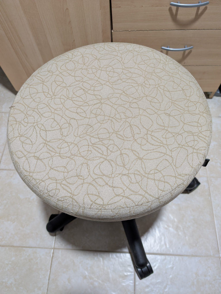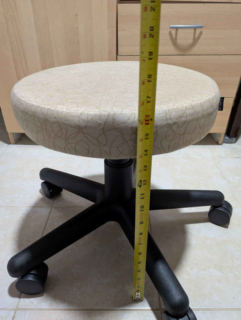 Here's a rolling stool with adjustable height! The seat is a neutral colour with a subtle pattern. The base is black and has five wheels for easy movement. The height is adjustable, as shown in the photos, perfect for different tasks or users. Dimensions are on the photos...