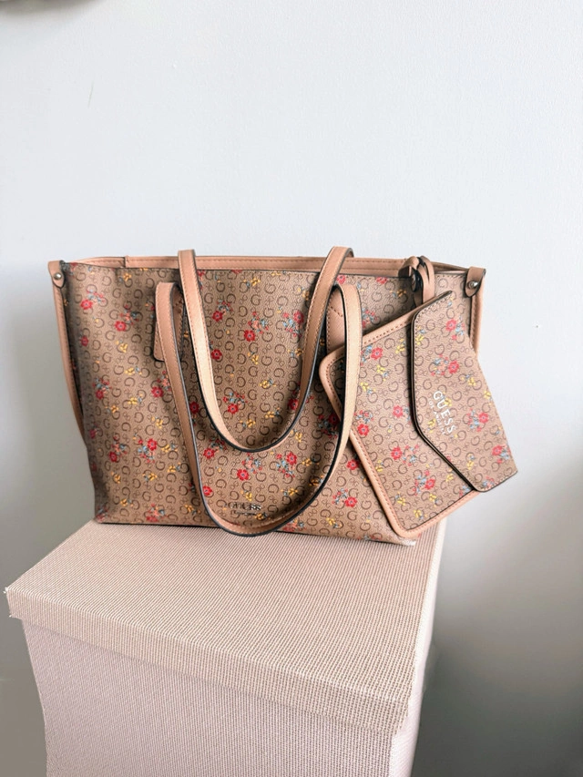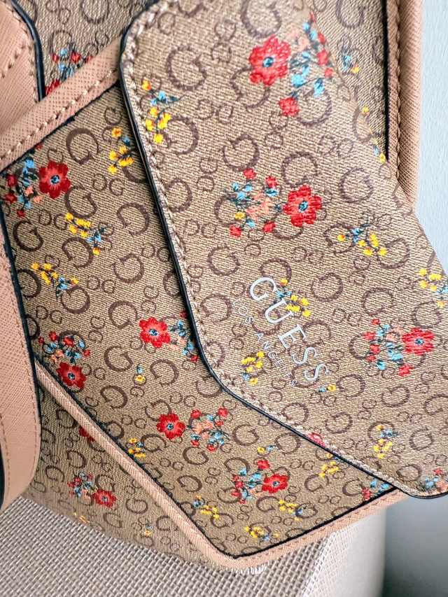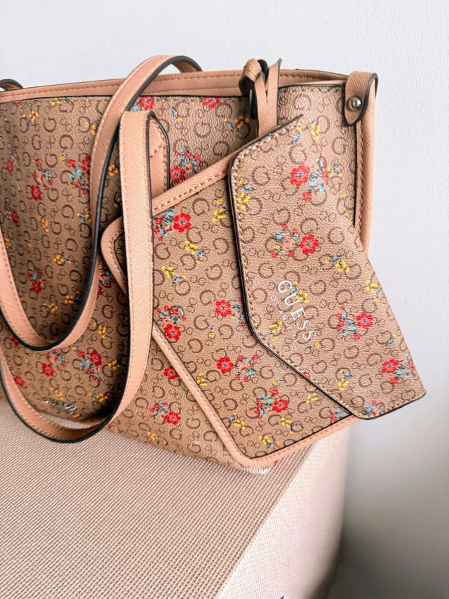 73This Guess brown floral tote and purse set is a stylish addition to any wardrobe. Featuring the signature logo with a colourful floral pattern, this set includes a spacious tote bag and a matching smaller purse, perfect for keeping your essentials organized. The bag has some signs of wear, but remains in good condition. I’m selling lots of great items that need to go.