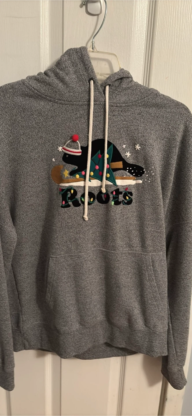 15Cozy up in this grey Roots hoodie featuring a festive beaver design! It's perfect for adding a touch of Canadian charm to your wardrobe during the holidays or any time of year