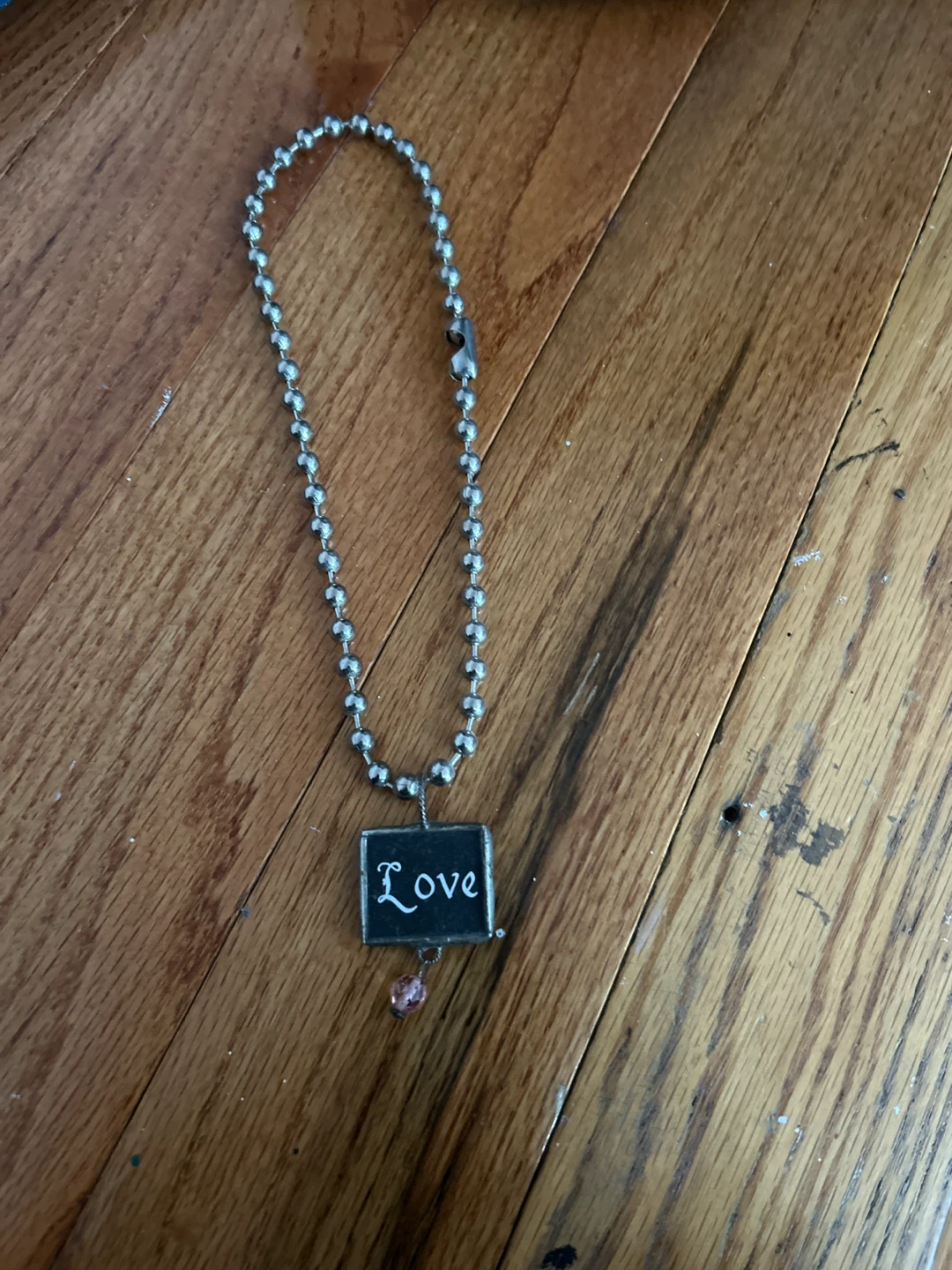 Cute silver chain necklace with a pendant that says 'Love'