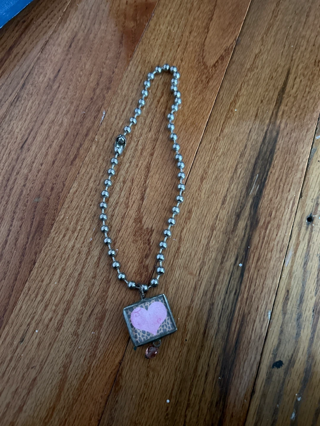 The pendant has a black background with white lettering on one side and a pink heart on the other