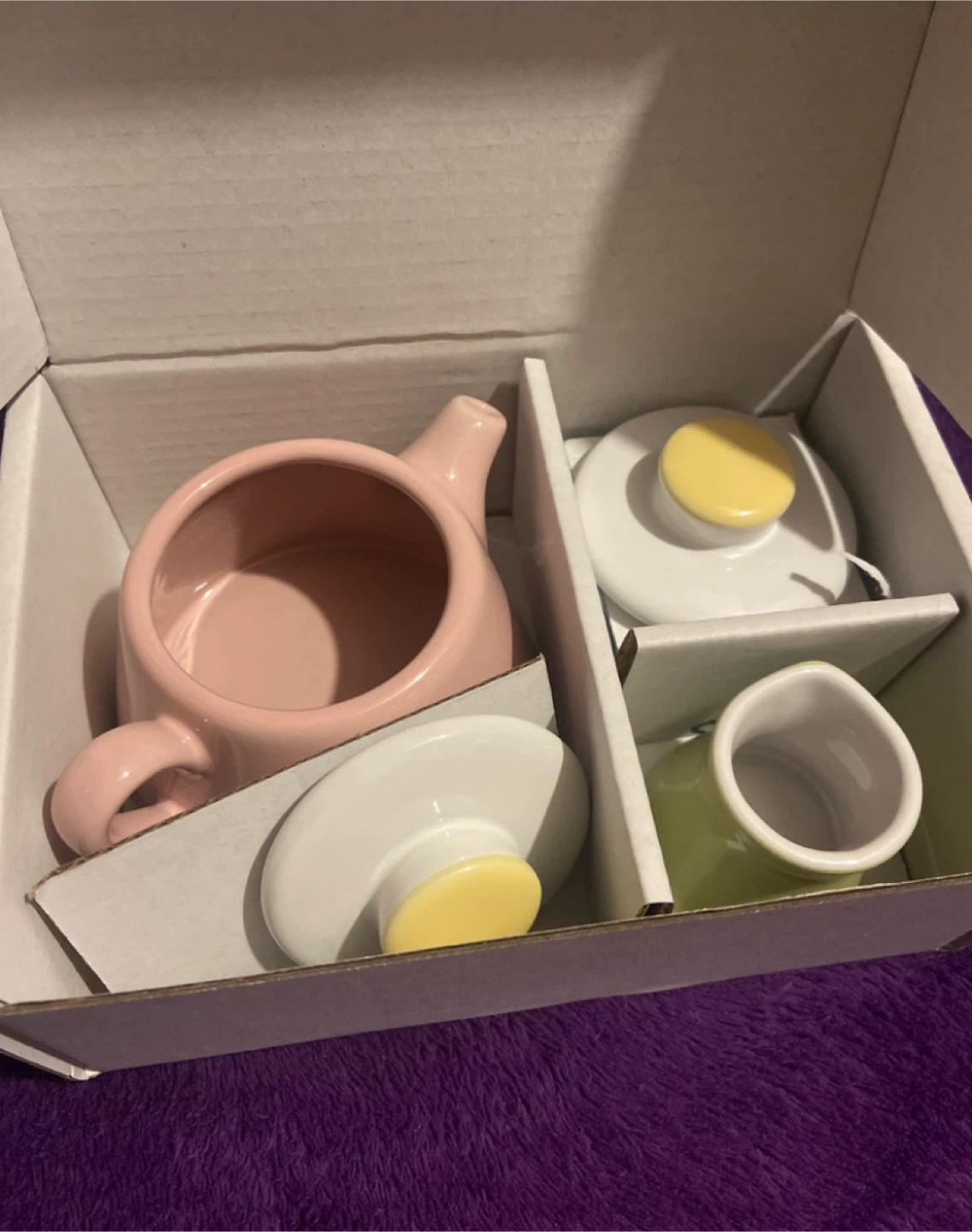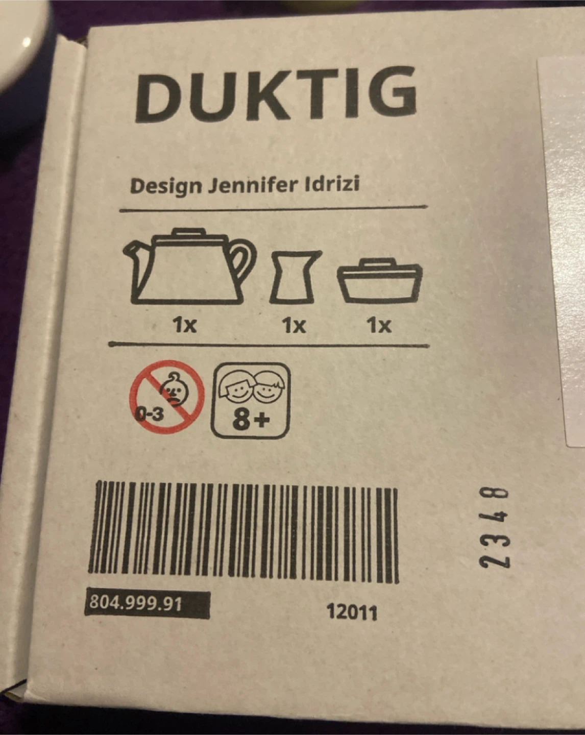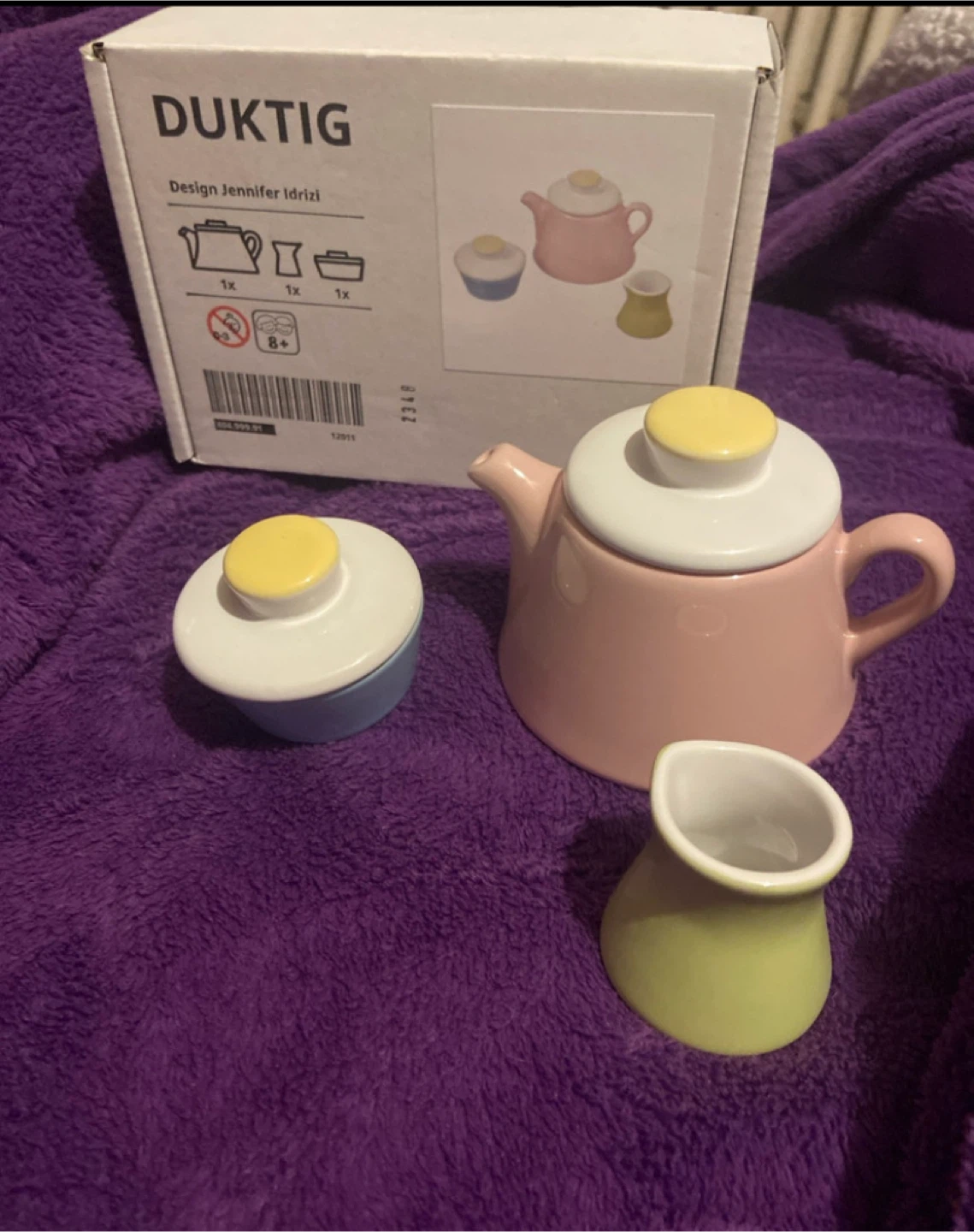 Get ready for a delightful tea party with this adorable Ikea Duktig toy tea set! This set includes a teapot, creamer, sugar bowl, and other essential pieces to inspire imaginative play. This is a new item in the box. Never been use. Only took out for the photos.
