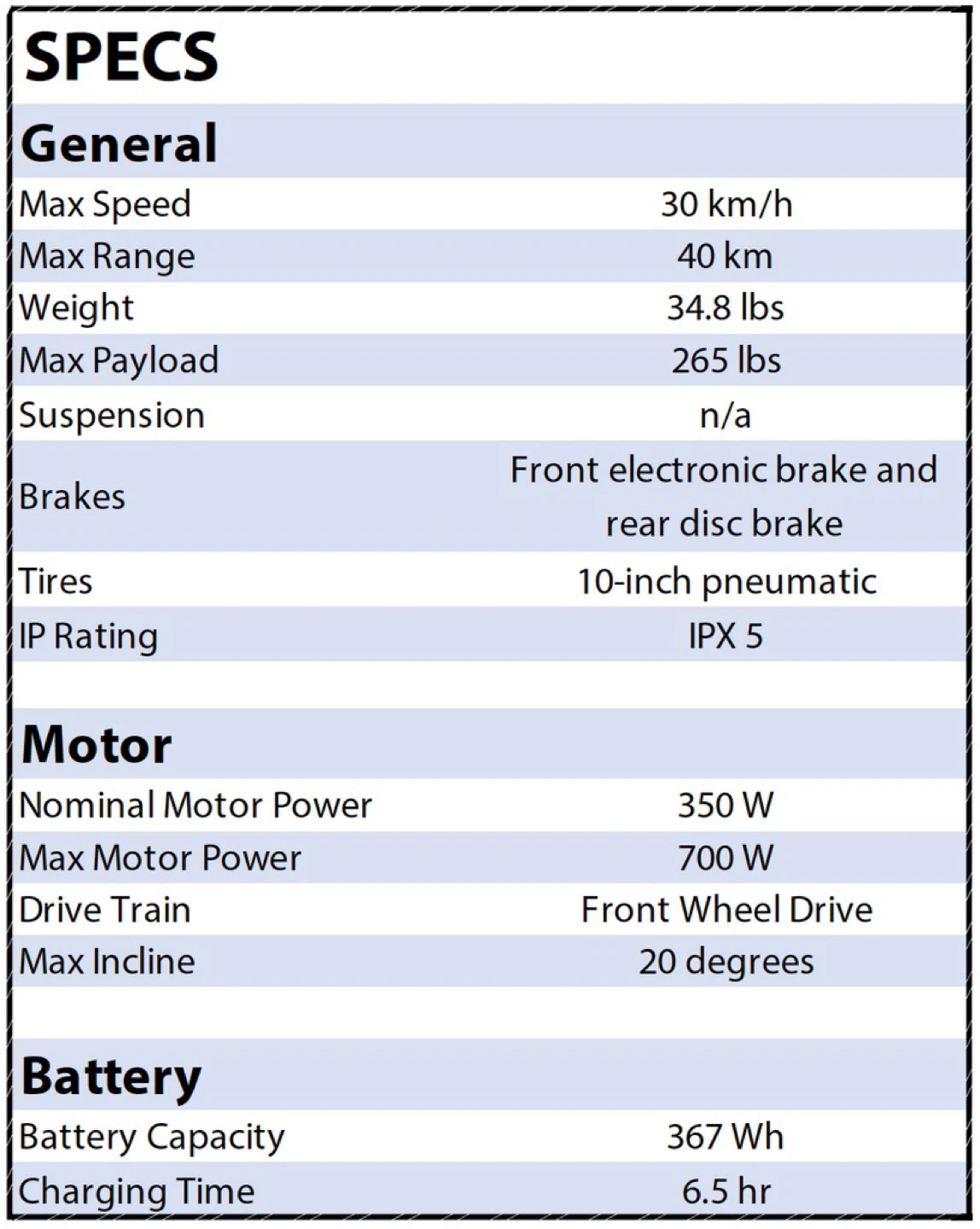- Max speed: 30 km/h