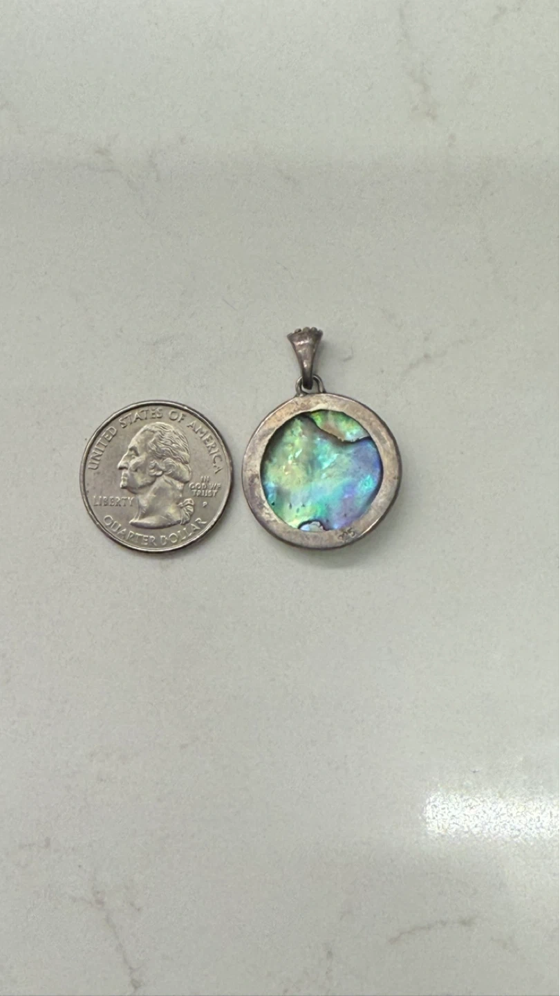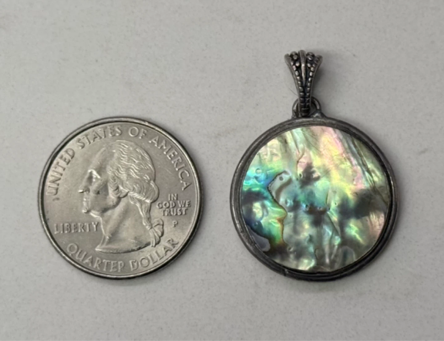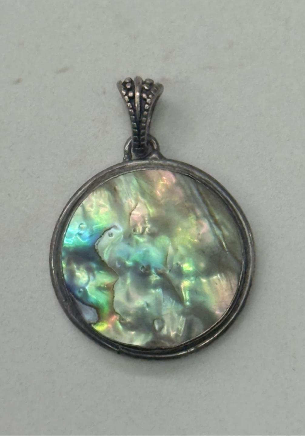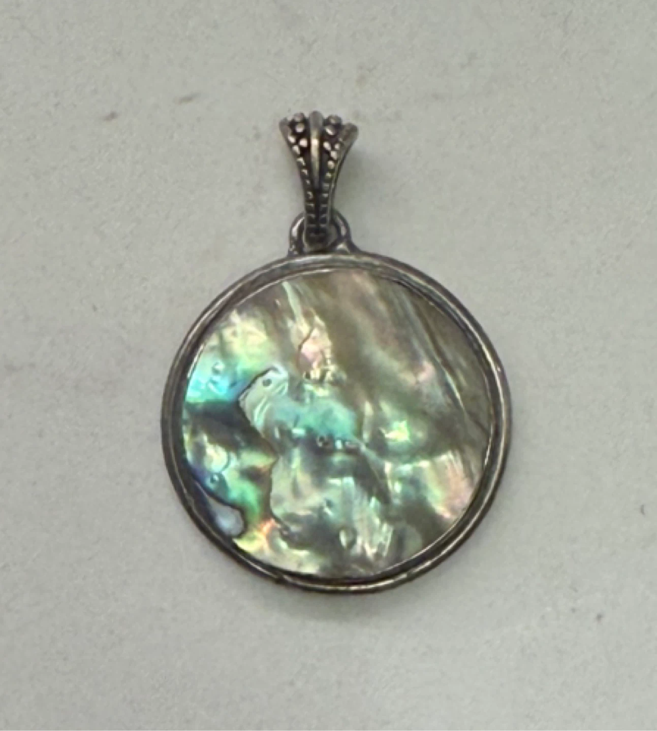 Selling a unique abalone shell pendant! It features a beautiful iridescent shell with a silver-tone setting. The pendant has a sterling silver decorative setting.