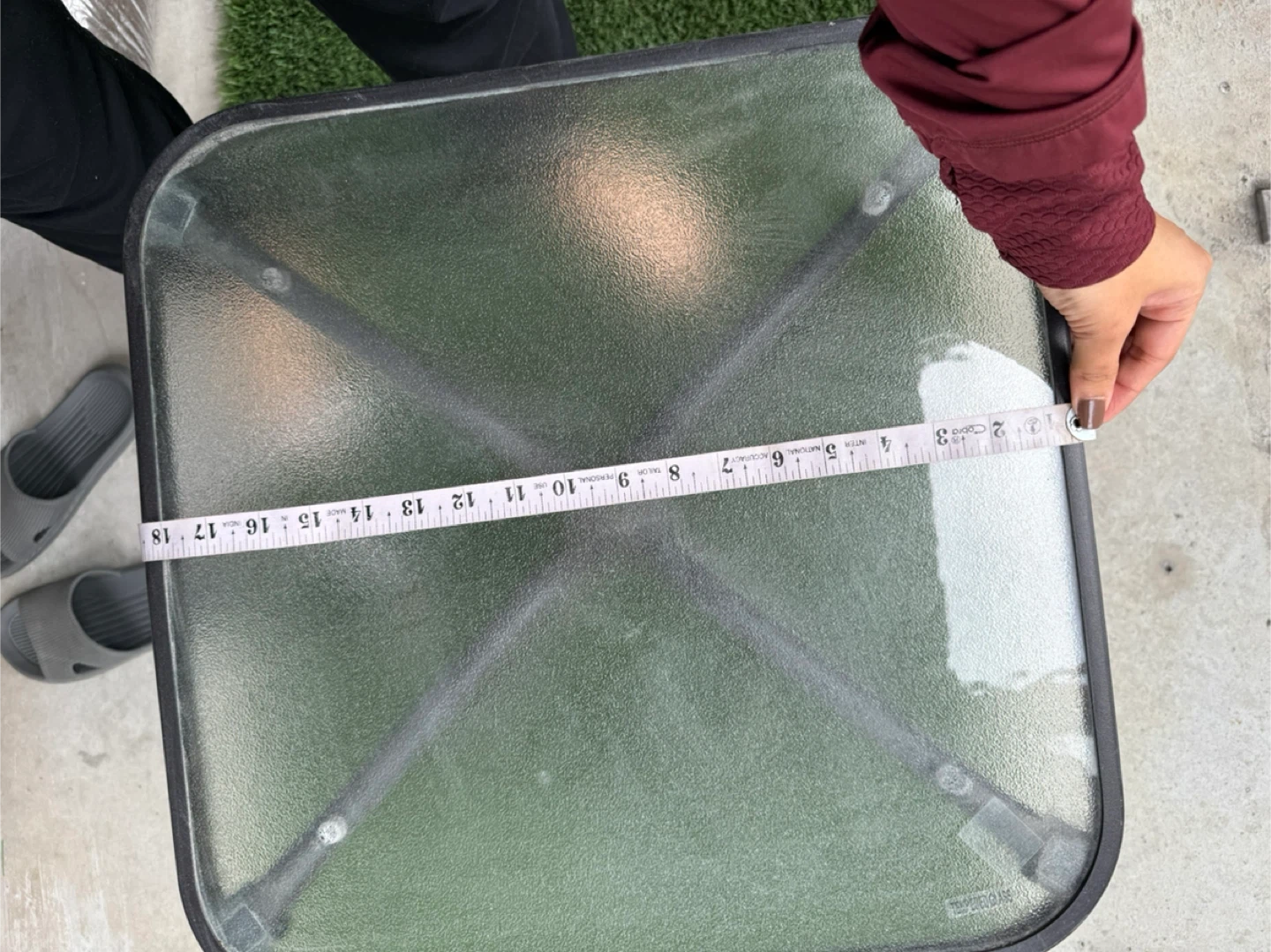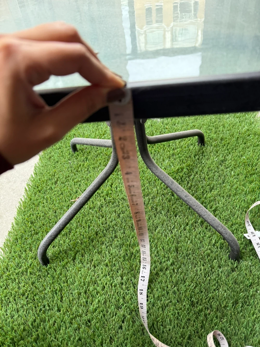 Selling a glass top end table for a patio. It's about 18 inches square and stands approximately 17.5 inches tall.
